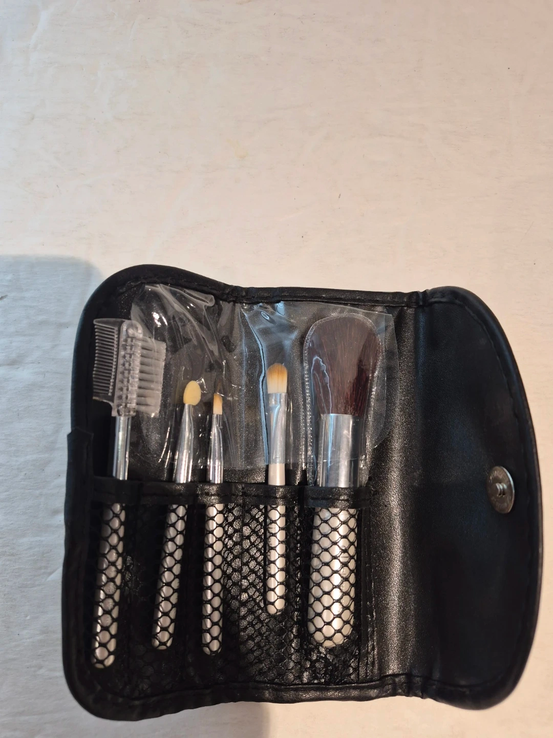 5-piece makeup brush set from e.l.f. Essentials. It includes various brushes and a comb, all housed in a black faux leather case. The case has a snap closure to keep everything secure. It's handy for on-the-go touch-ups!