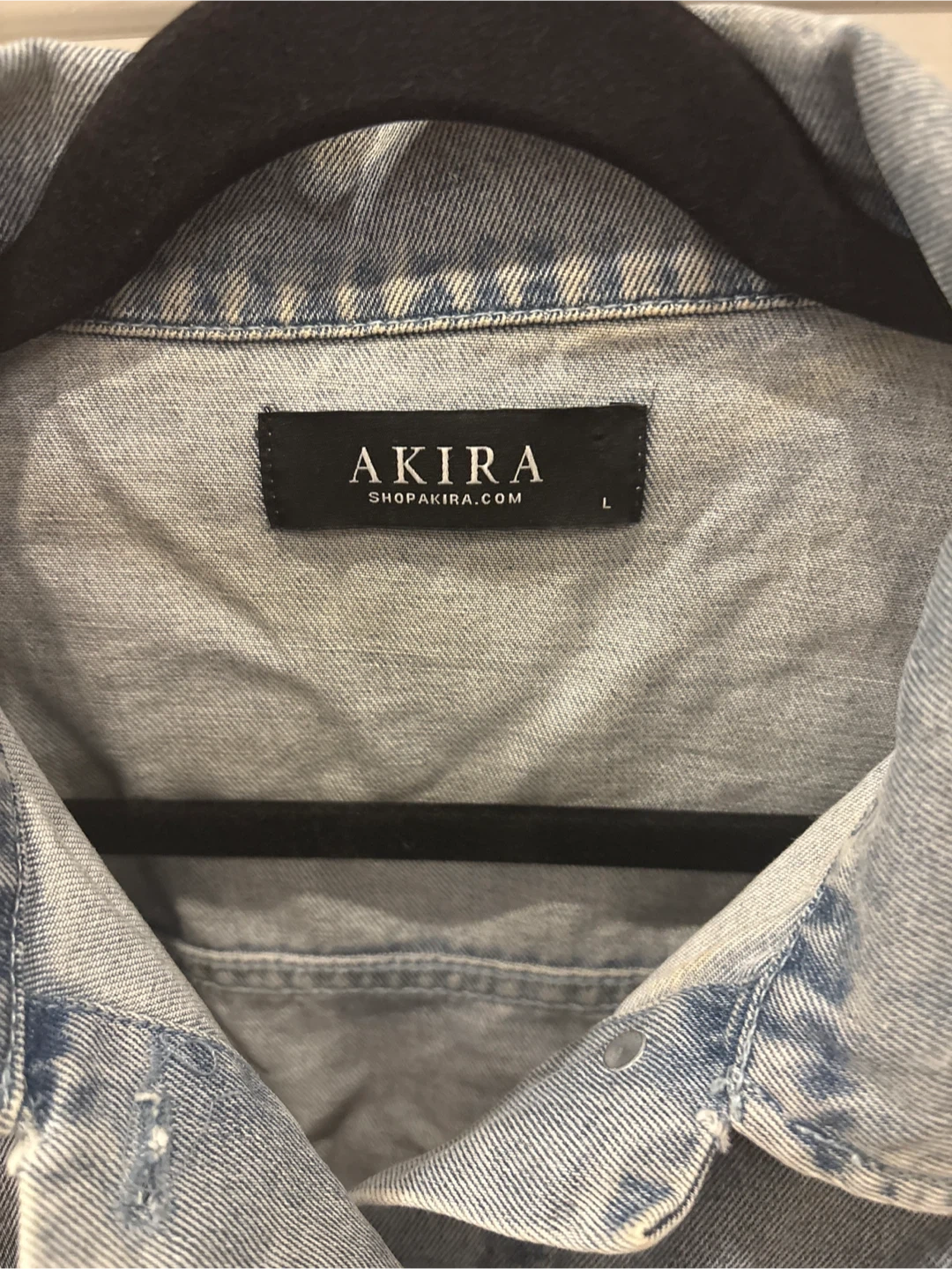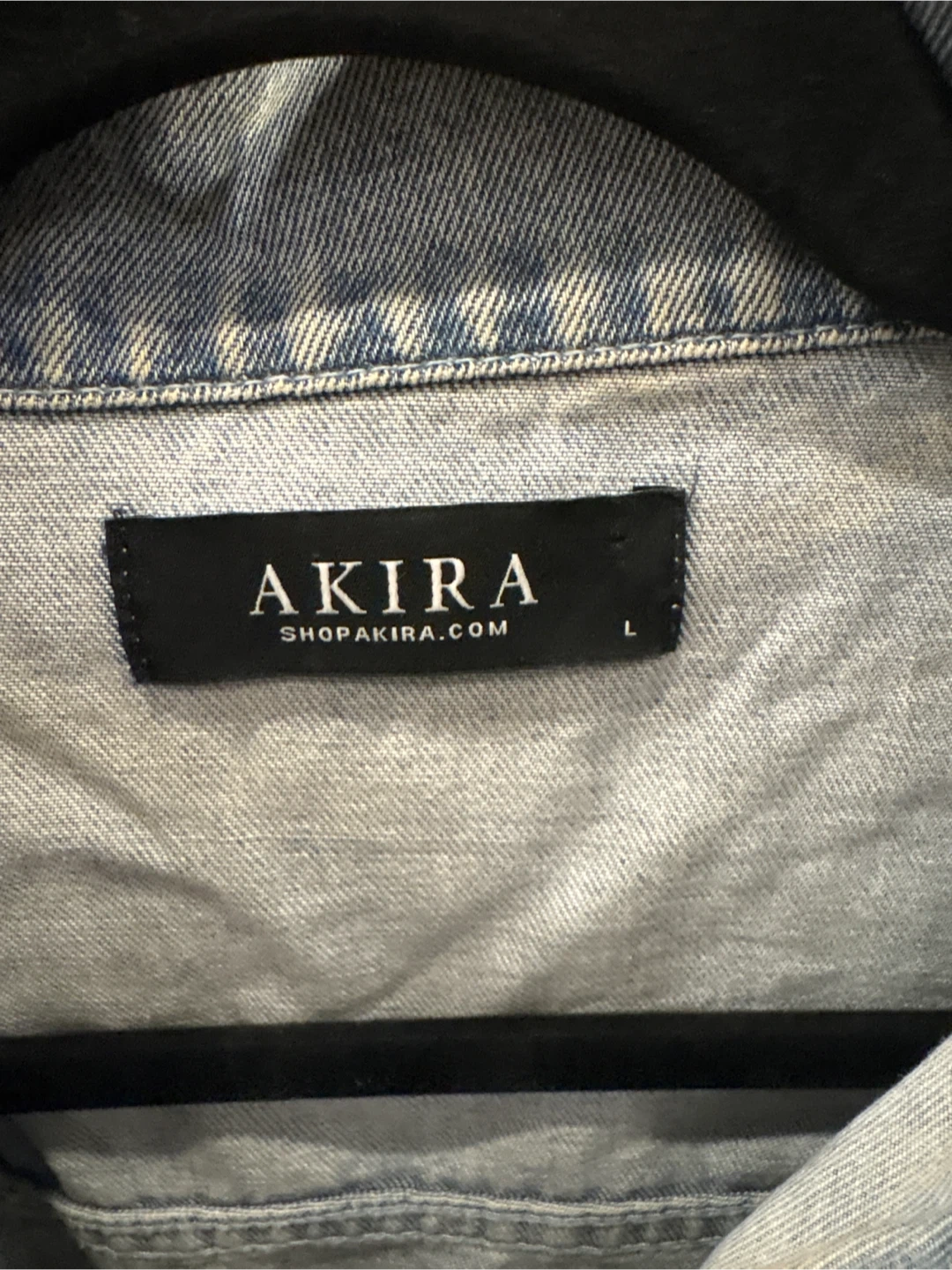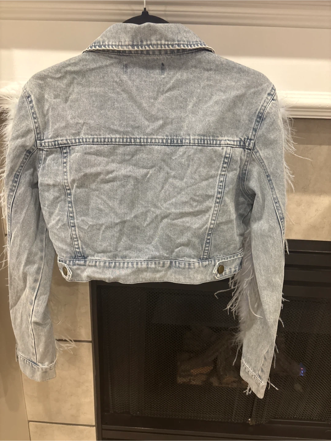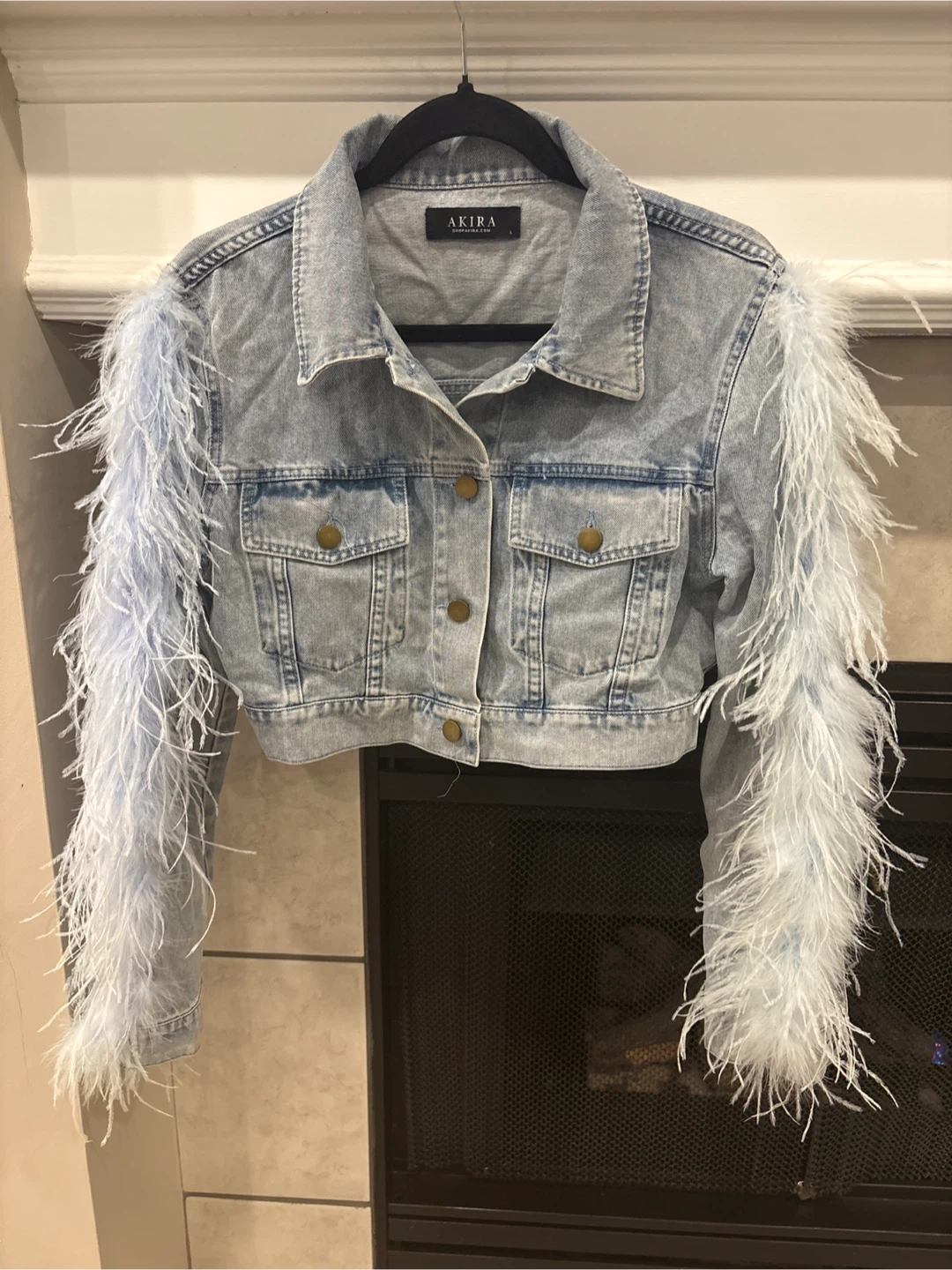 AKIRA cropped denim jacket. It's light wash denim with distinctive feather trim on the sleeves. Size L.