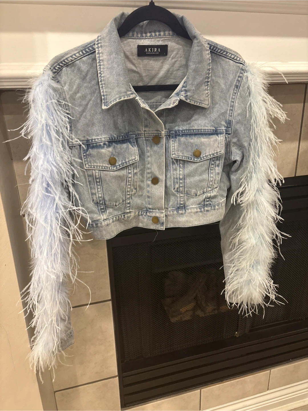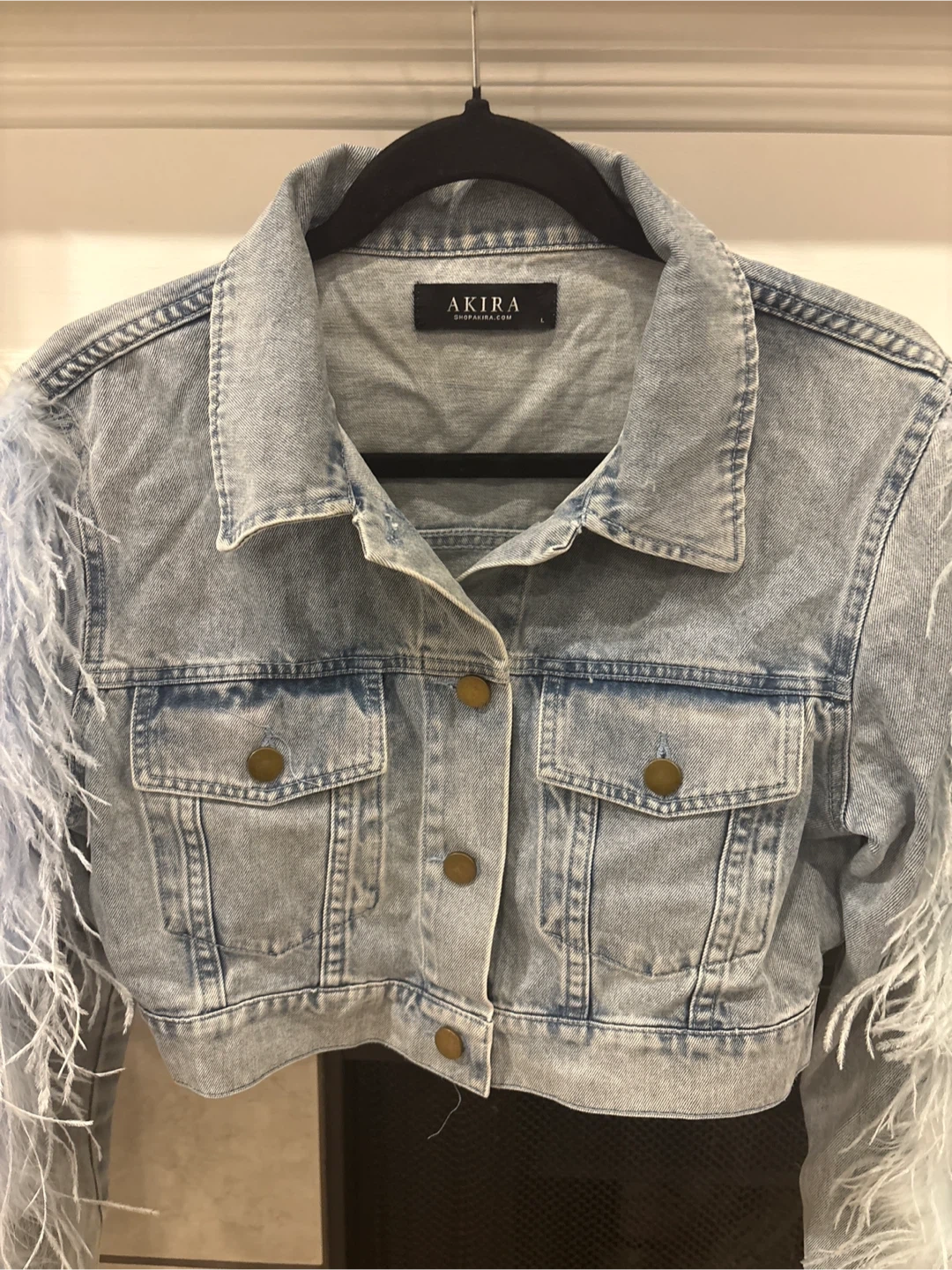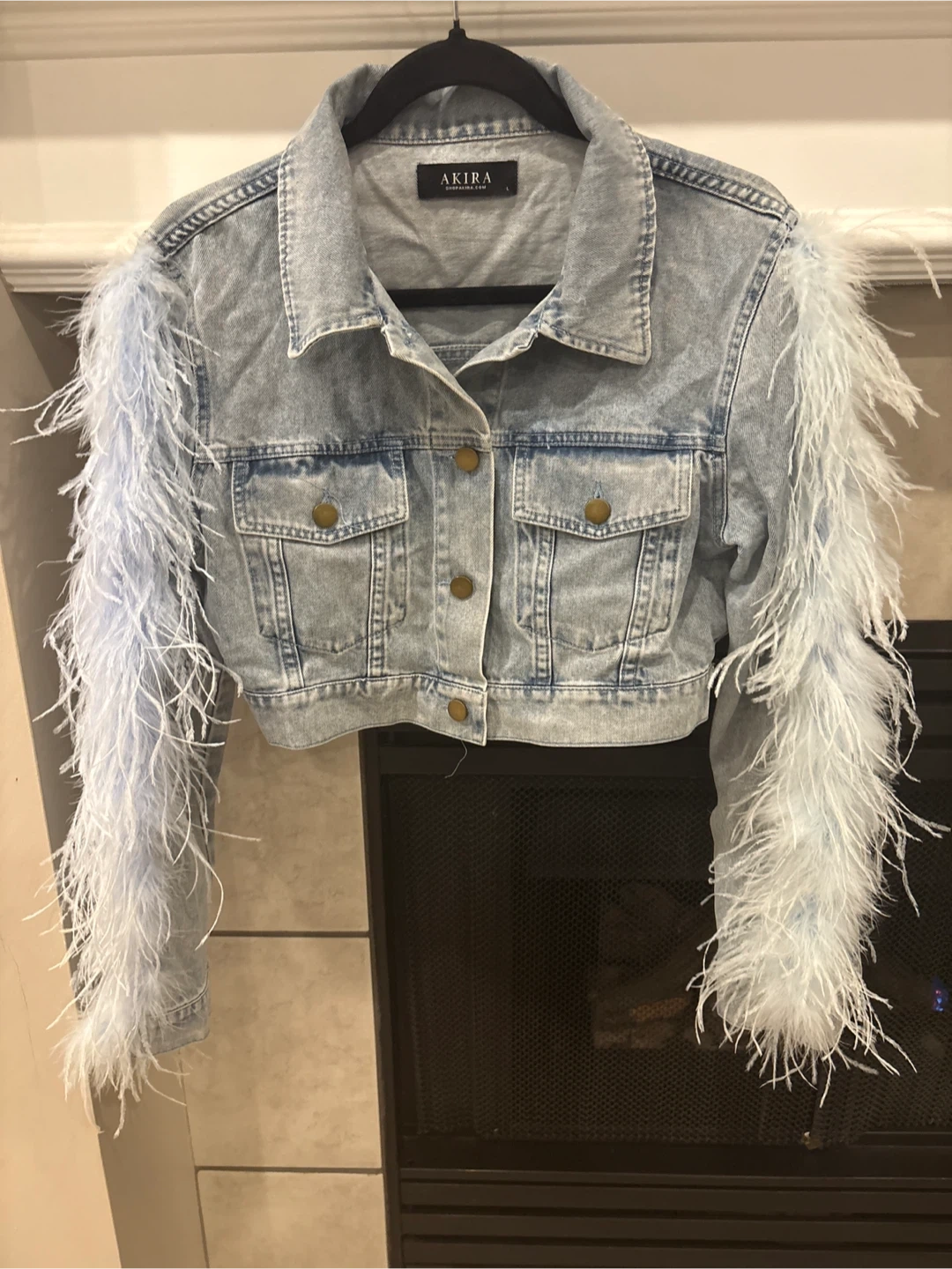 AKIRA cropped denim jacket. It's light wash denim with distinctive feather trim on the sleeves. Size L.