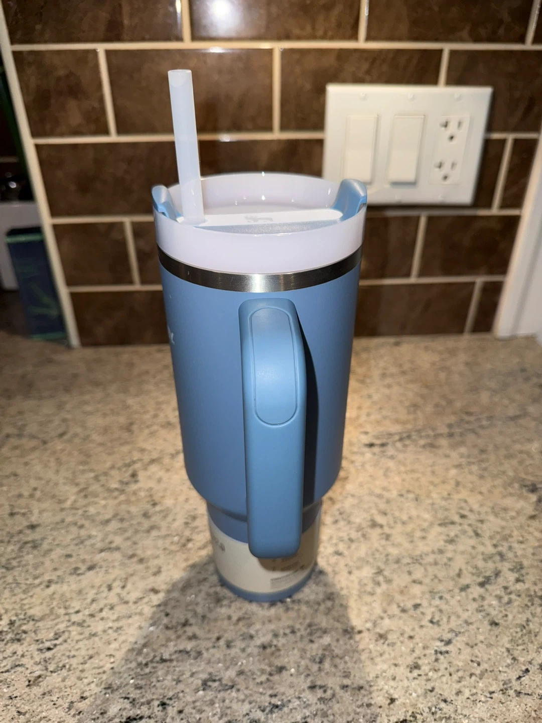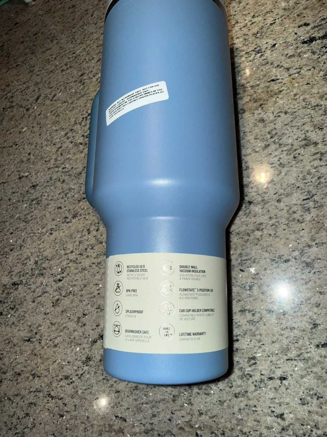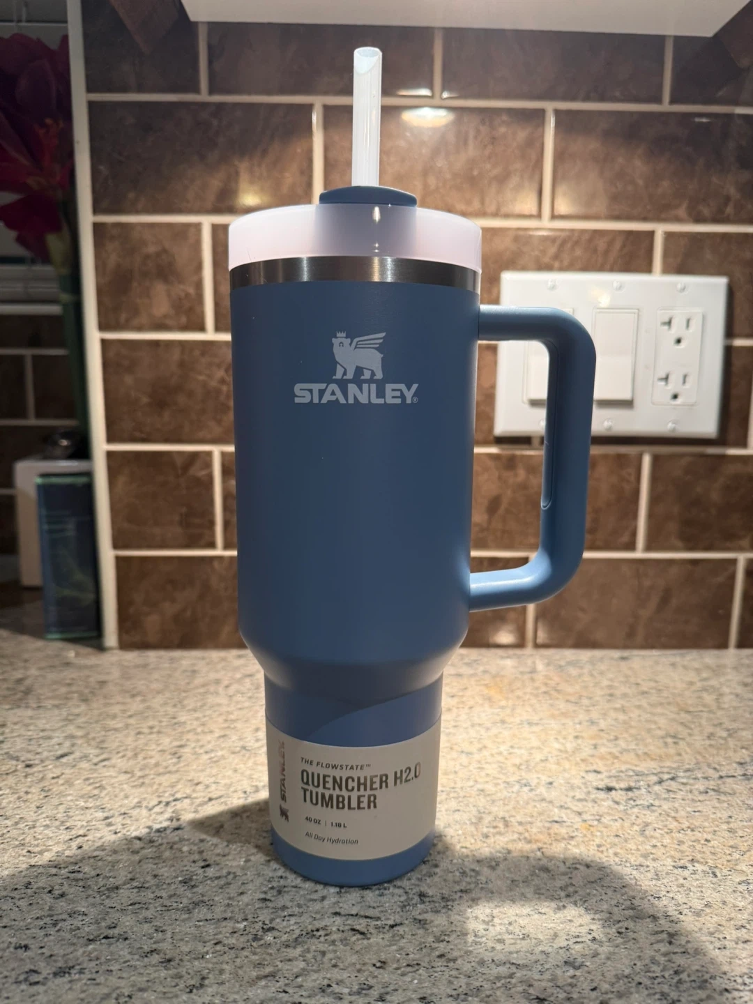 This brand new Stanley Flowstate Quencher H2.0 Tumbler holds 40 oz, or 1.18 L. It's made with recycled 18/8 stainless steel and features double-wall vacuum insulation. This tumbler keeps drinks cold for 11 hours, iced for 2 days, and hot for 7 hours. It's also BPA-free, splash-proof, dishwasher safe, and car cup holder compatible.