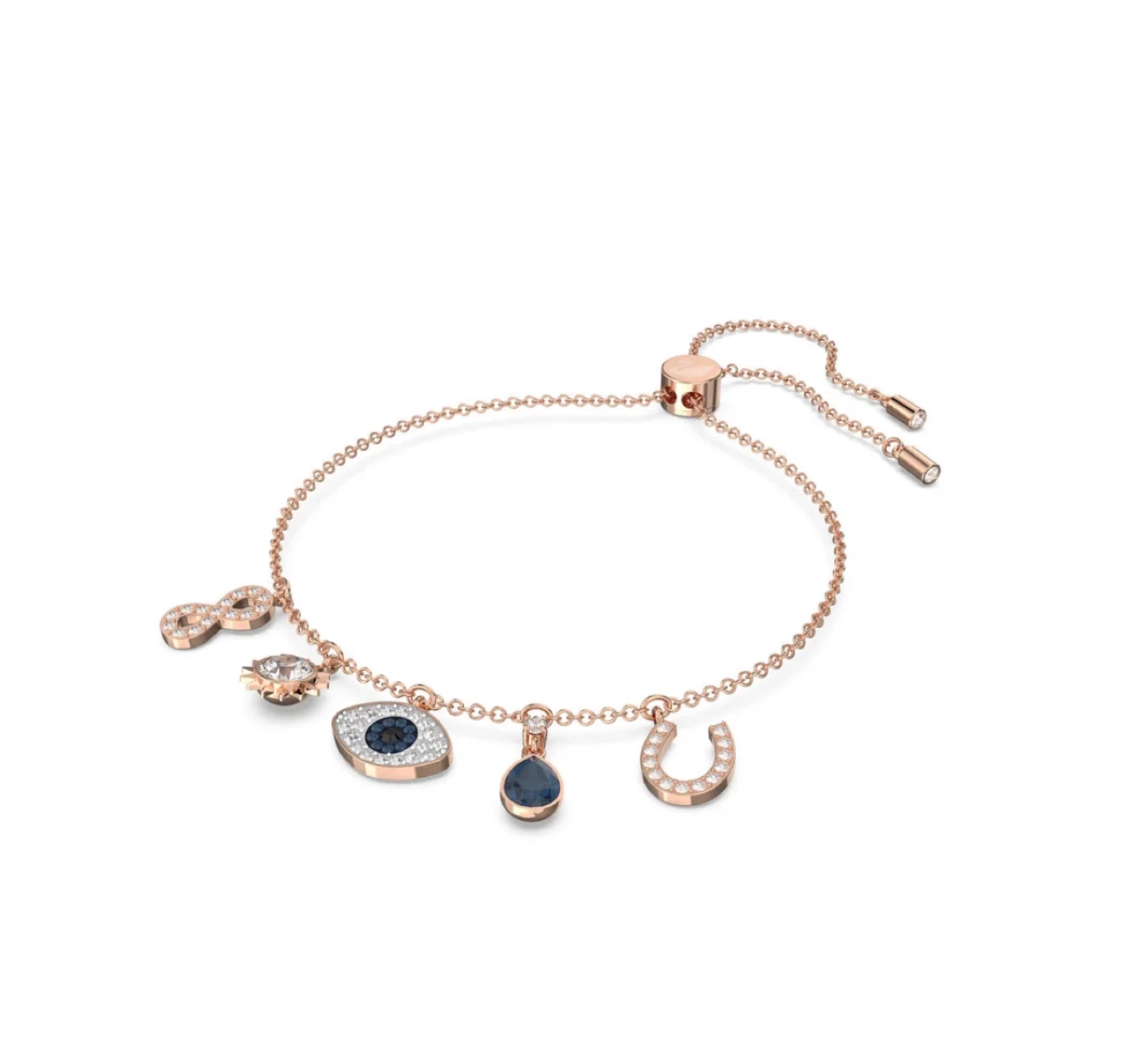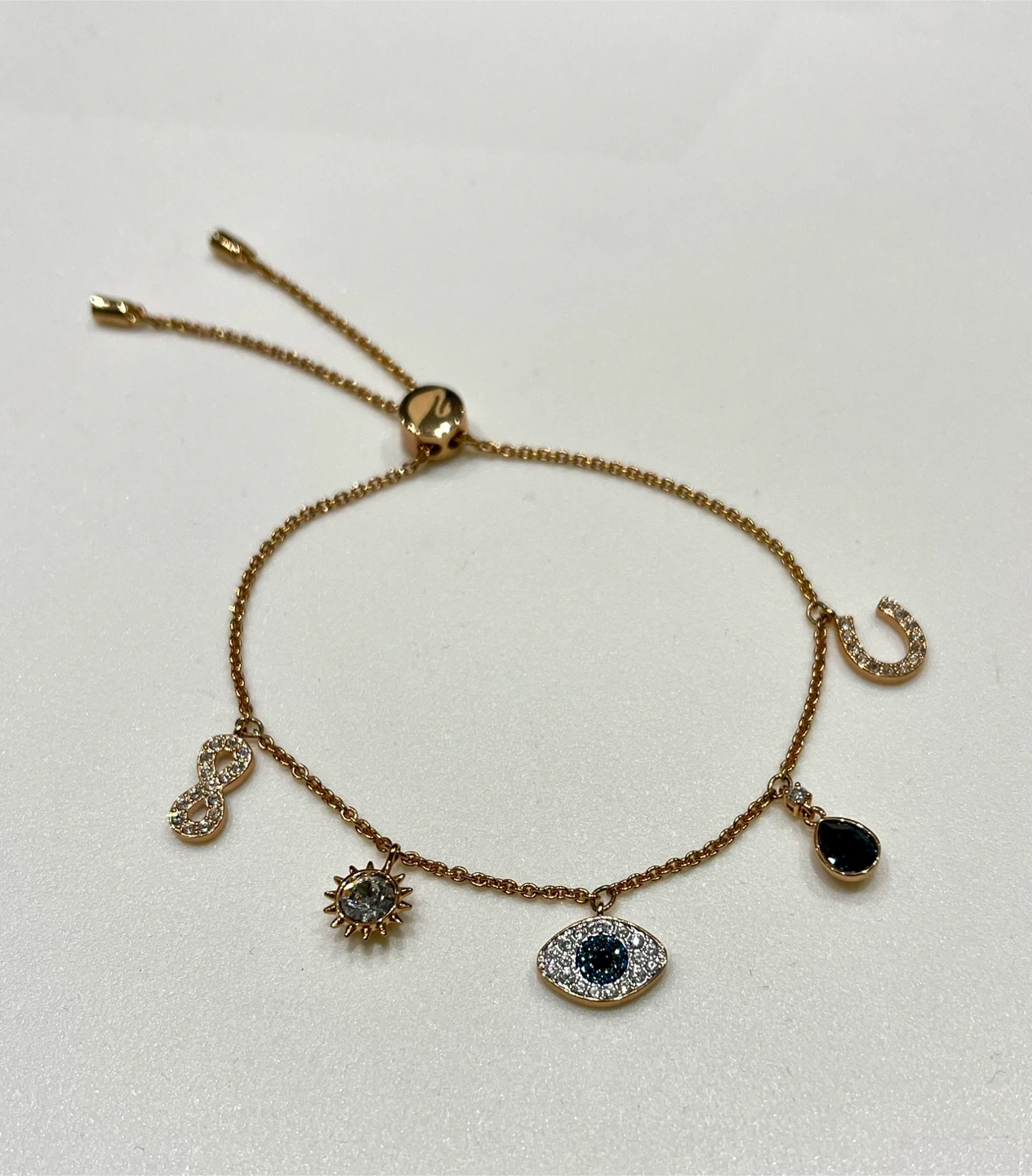 A delicate rose gold tone plated bracelet from Swarovski. It features various charms including an evil eye, horseshoe, and infinity symbol. The bracelet is adjustable for a perfect fit. This piece adds a touch of sparkle and good fortune!