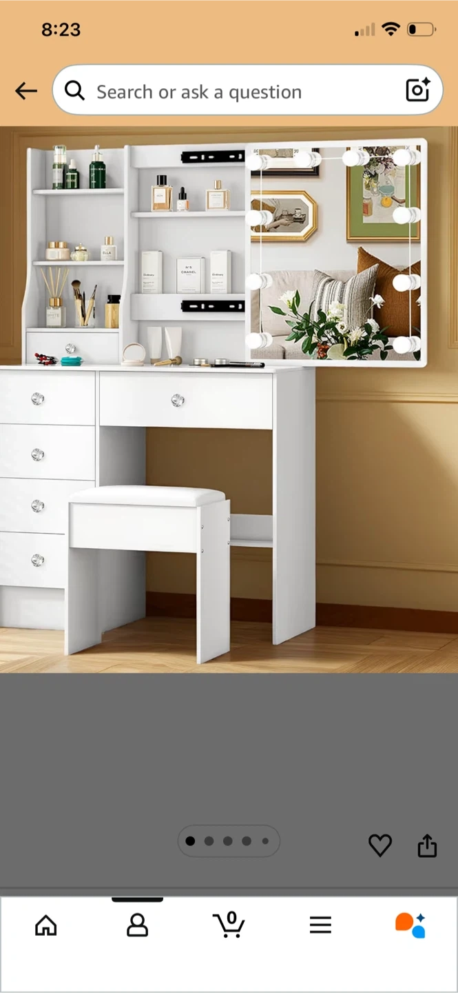 This white vanity dressing table features multiple drawers and shelves for storage. It comes with a matching stool and a detached mirror with lights. Perfect for organizing your makeup and accessories.