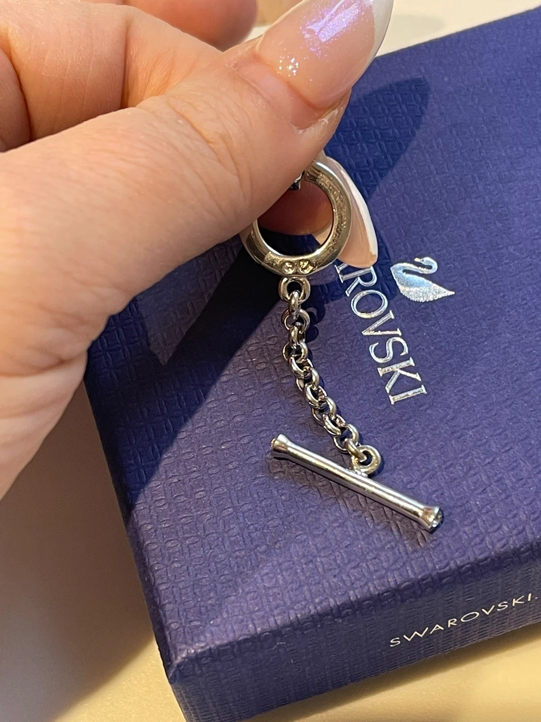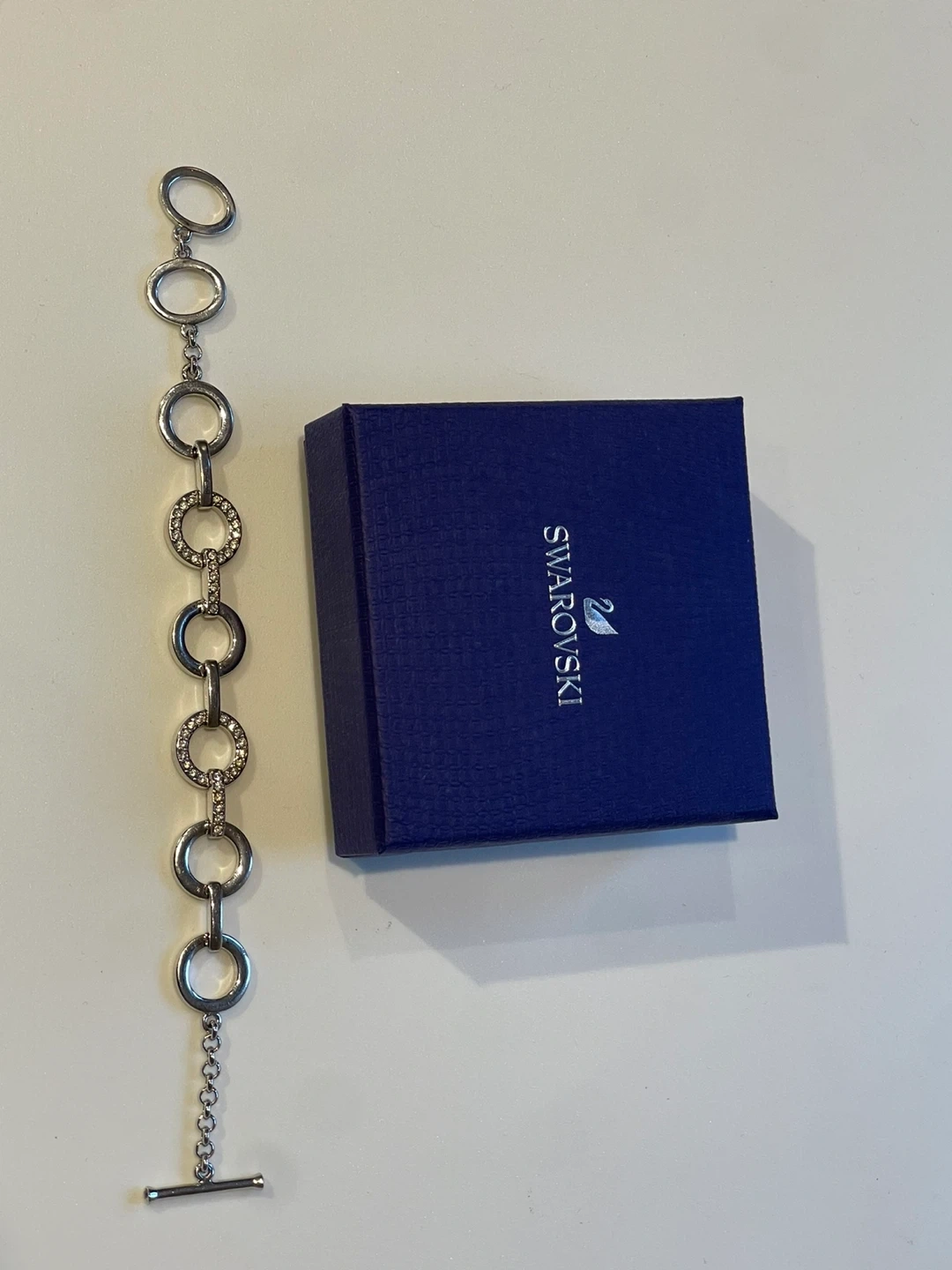 Beautiful Swarovski bracelet featuring interlocking circular links adorned with sparkling crystals. It fastens with a secure toggle clasp. This elegant piece comes with its original Swarovski box.