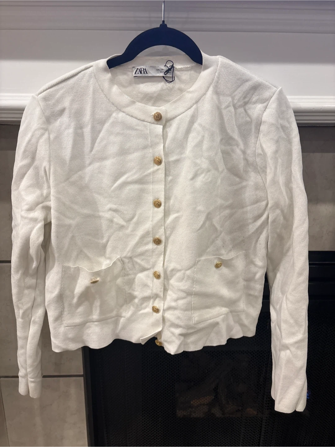 This ZARA cardigan is white and made from a knit material. It features a button-up front and decorative gold buttons on the pockets. It's a size L, perfect for layering.