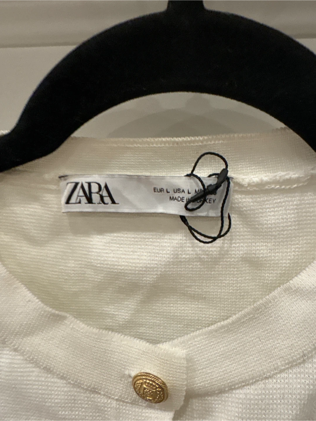 This ZARA cardigan is white and made from a knit material. It features a button-up front and decorative gold buttons on the pockets. It's a size L, perfect for layering.