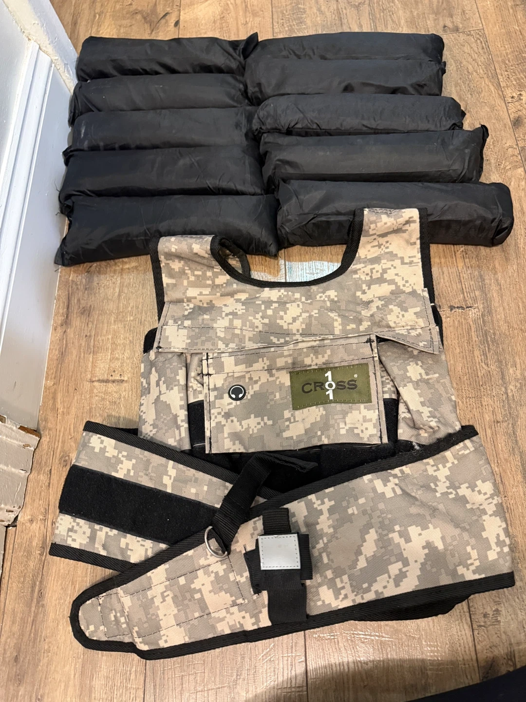 This adjustable camouflage weighted vest from CROSS101 comes with shoulder pads and 60 lbs of weight. It's designed for fitness training. Includes multiple weight pockets.
