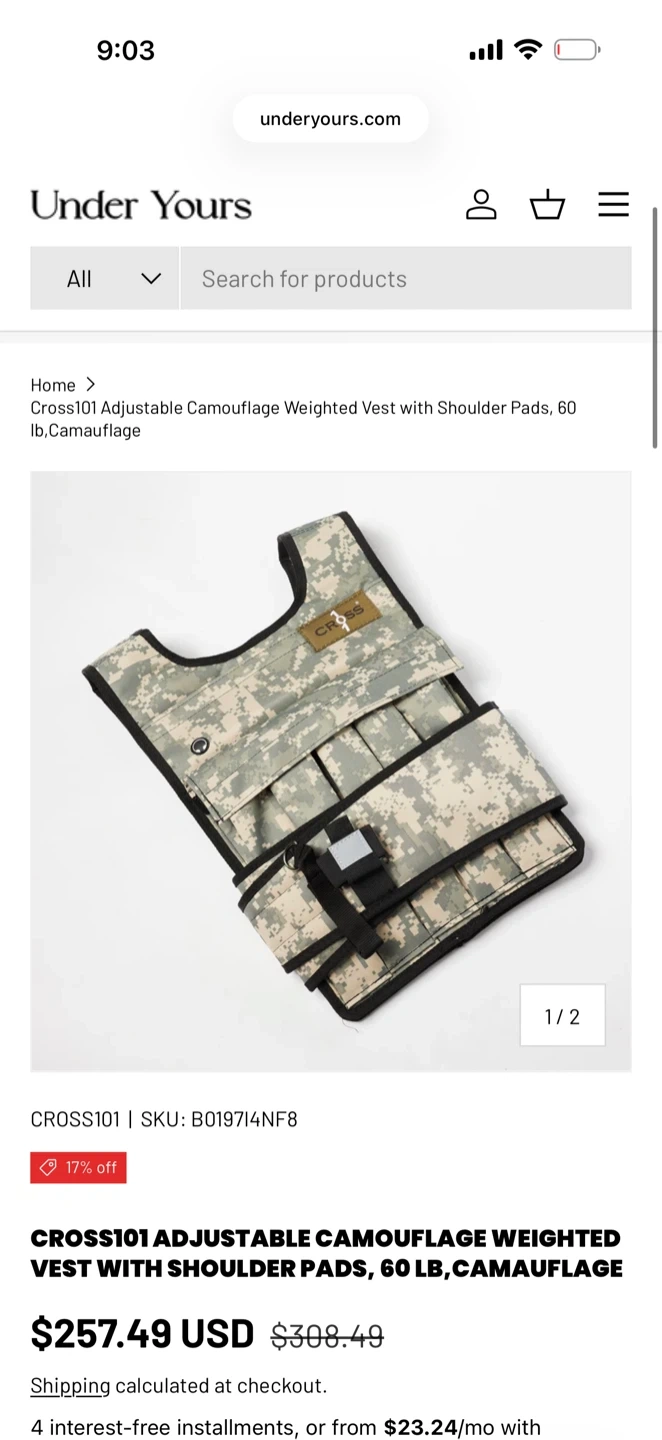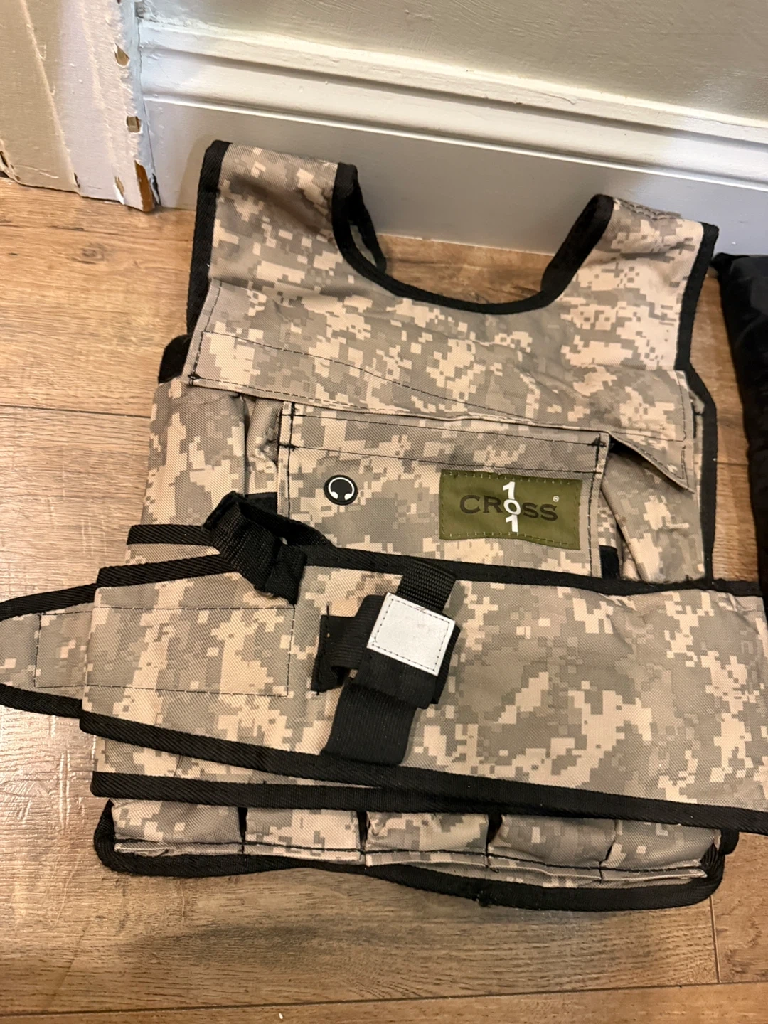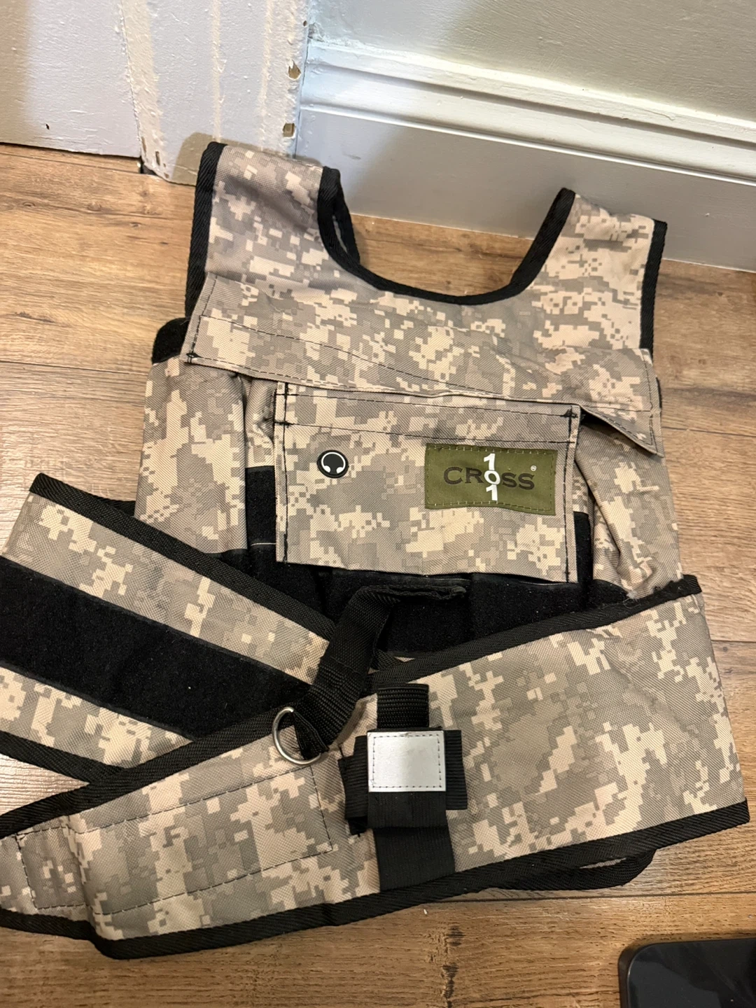 This adjustable camouflage weighted vest from CROSS101 comes with shoulder pads and 60 lbs of weight. It's designed for fitness training. Includes multiple weight pockets.