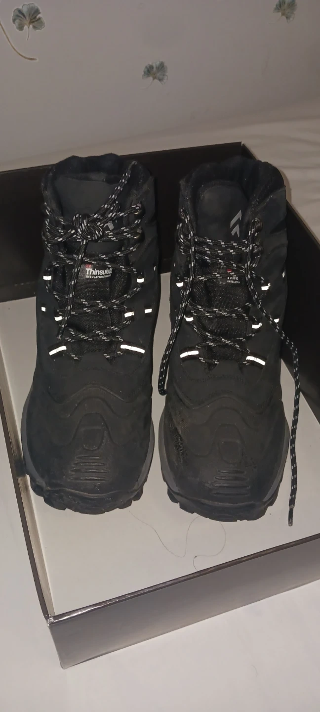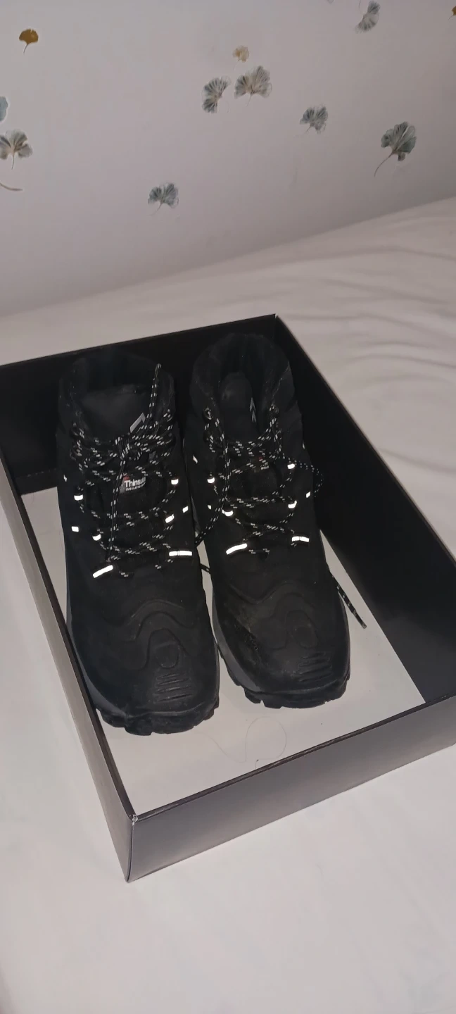 These black winter boots feature Thinsulate insulation for warmth. They come in a size 8. These boots are great for keeping your feet toasty during the colder months!