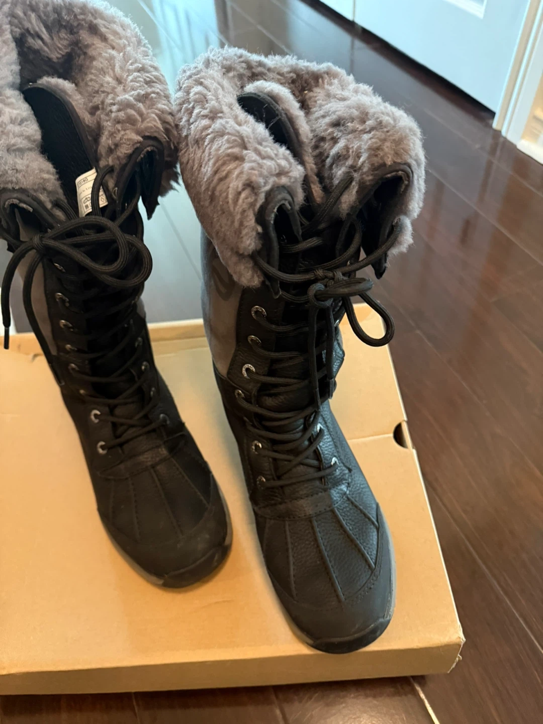 These UGG winter boots are black with grey faux fur lining and trim. They feature a lace-up front and a waterproof rubber toe. Perfect for keeping your feet warm and dry during the colder months!