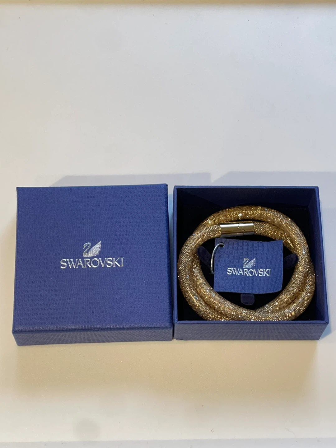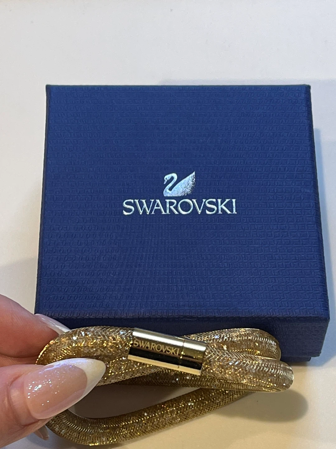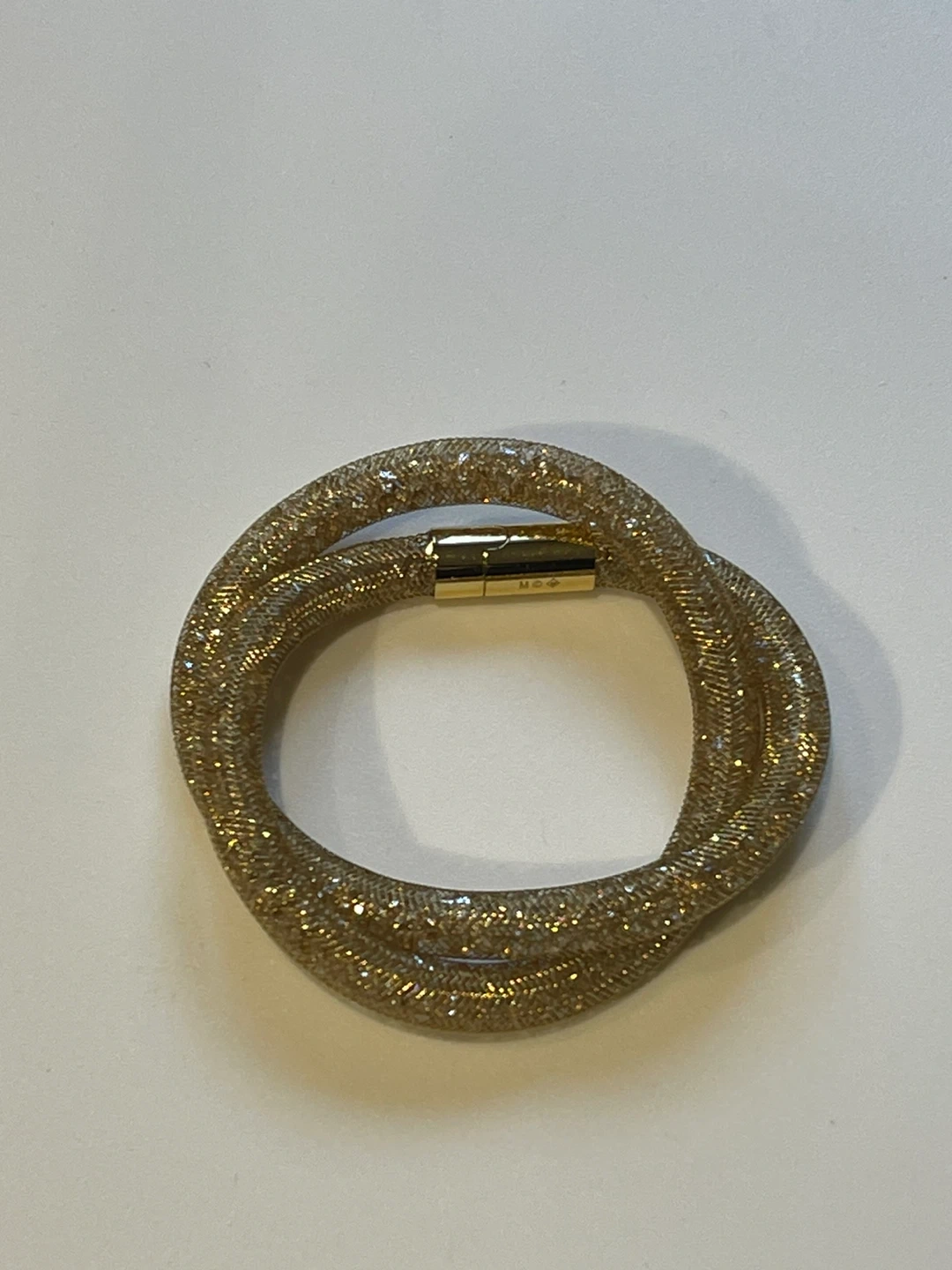 Sparkly gold-toned bracelet from Swarovski. It's designed with a mesh tube filled with tiny crystals and features a magnetic clasp for easy wear. Comes with the original blue Swarovski box.