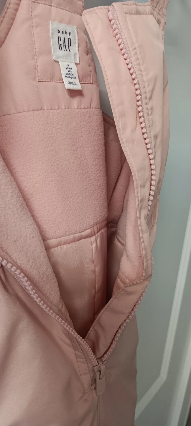 Baby Gap snow bibs in a sweet pink colour. Size is 3 years. Features adjustable straps and a full-zip front. Perfect for keeping little ones warm and dry during winter play!