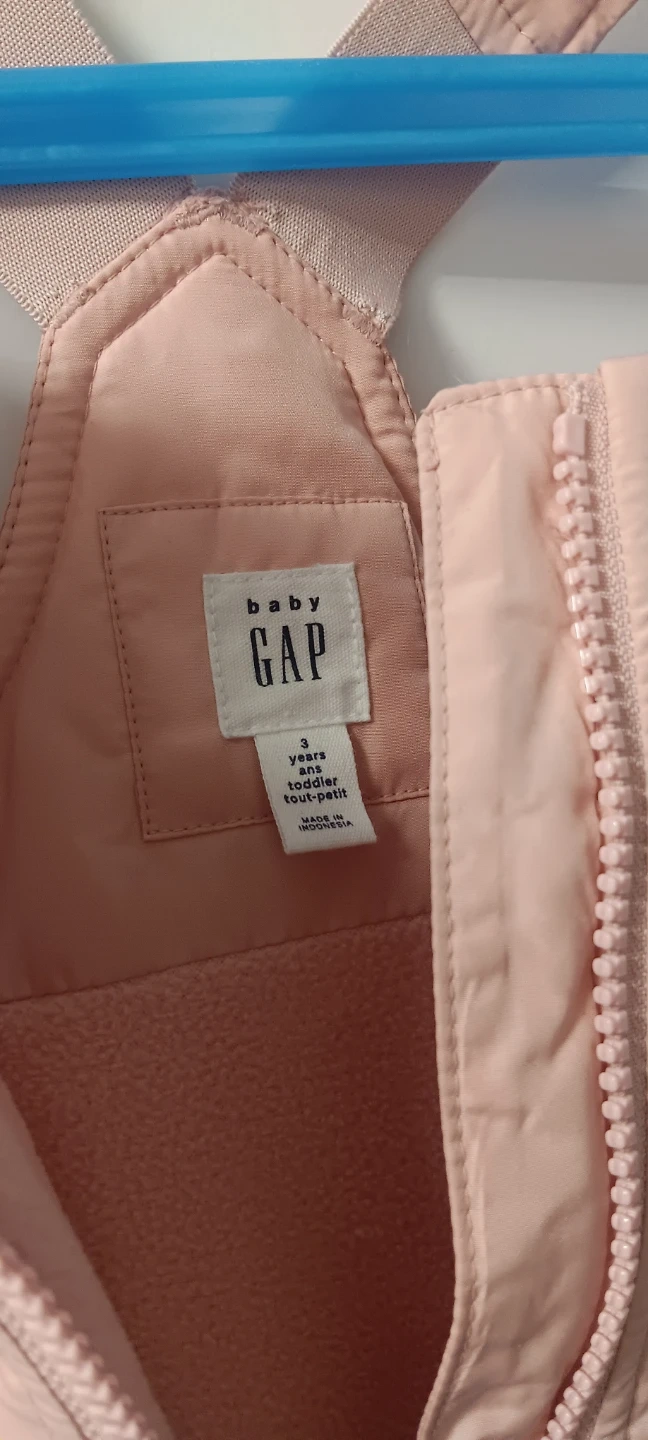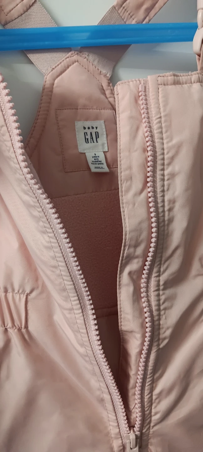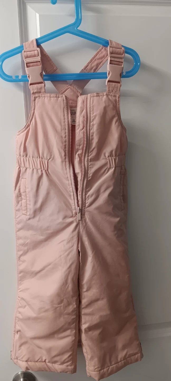 Baby Gap snow bibs in a sweet pink colour. Size is 3 years. Features adjustable straps and a full-zip front. Perfect for keeping little ones warm and dry during winter play!
