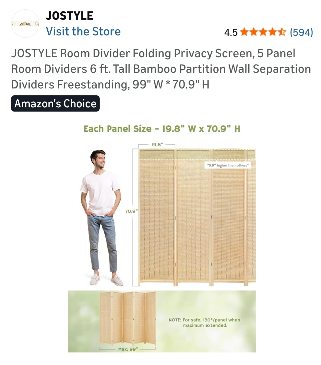 This JOSTYLE 5-panel folding privacy screen is made of natural bamboo. It's 6 ft tall and designed for freestanding use. Each panel measures 19.8" W x 70.9" H.