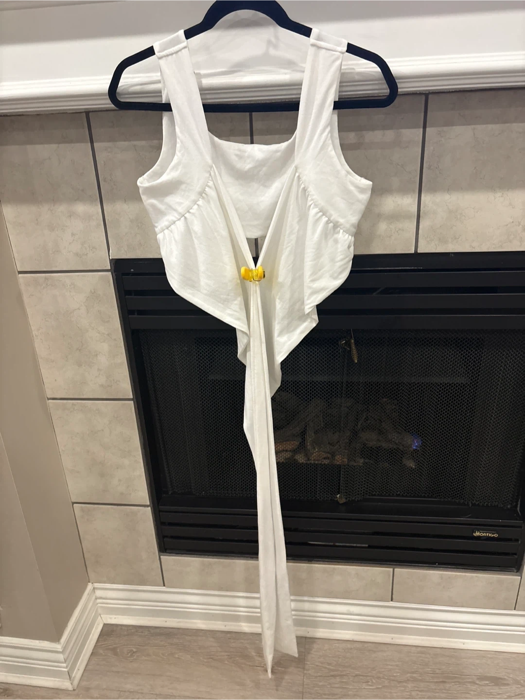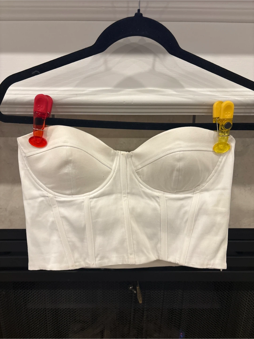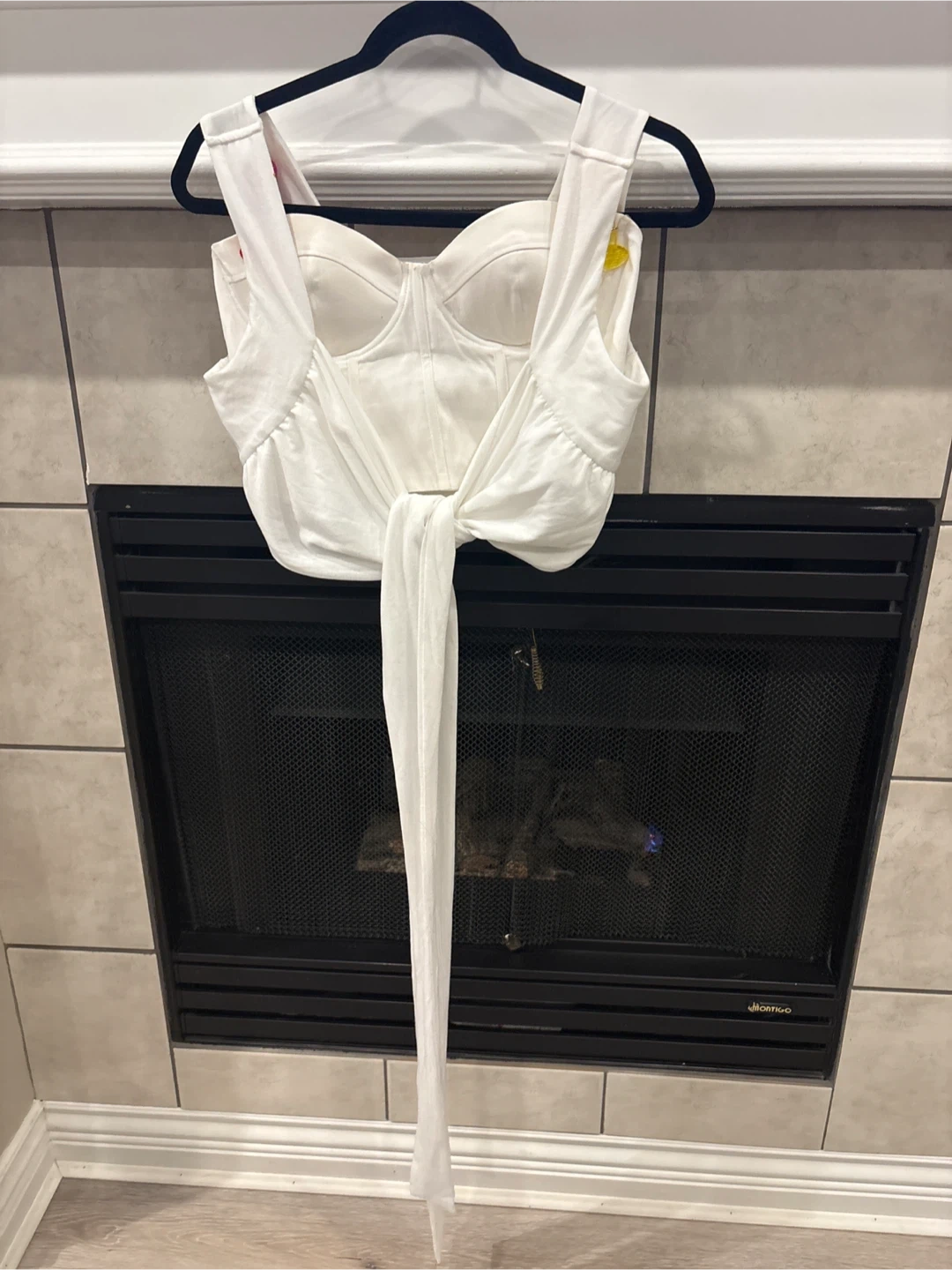 White corset-style top. It's made of a structured fabric with adjustable straps and a tie detail at the front. It features boning for shape.is a set of 2 pc the top is Zara and the cover is cider size L