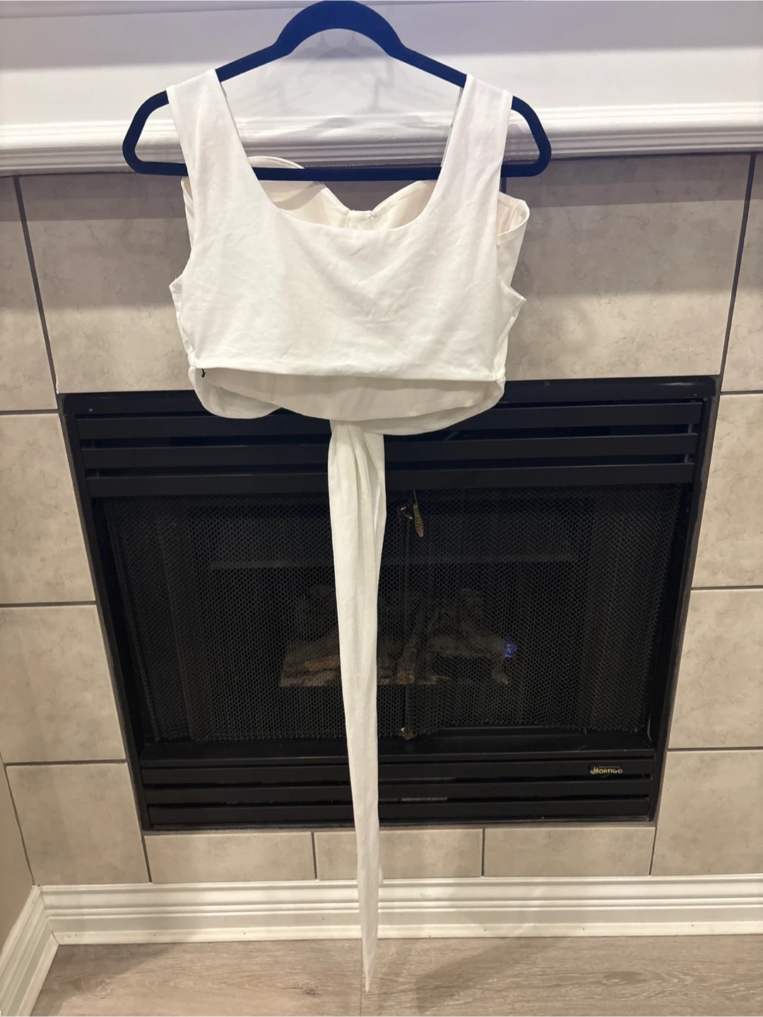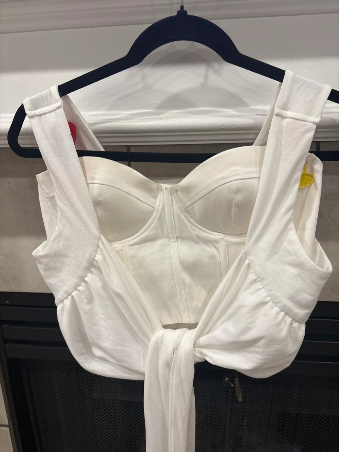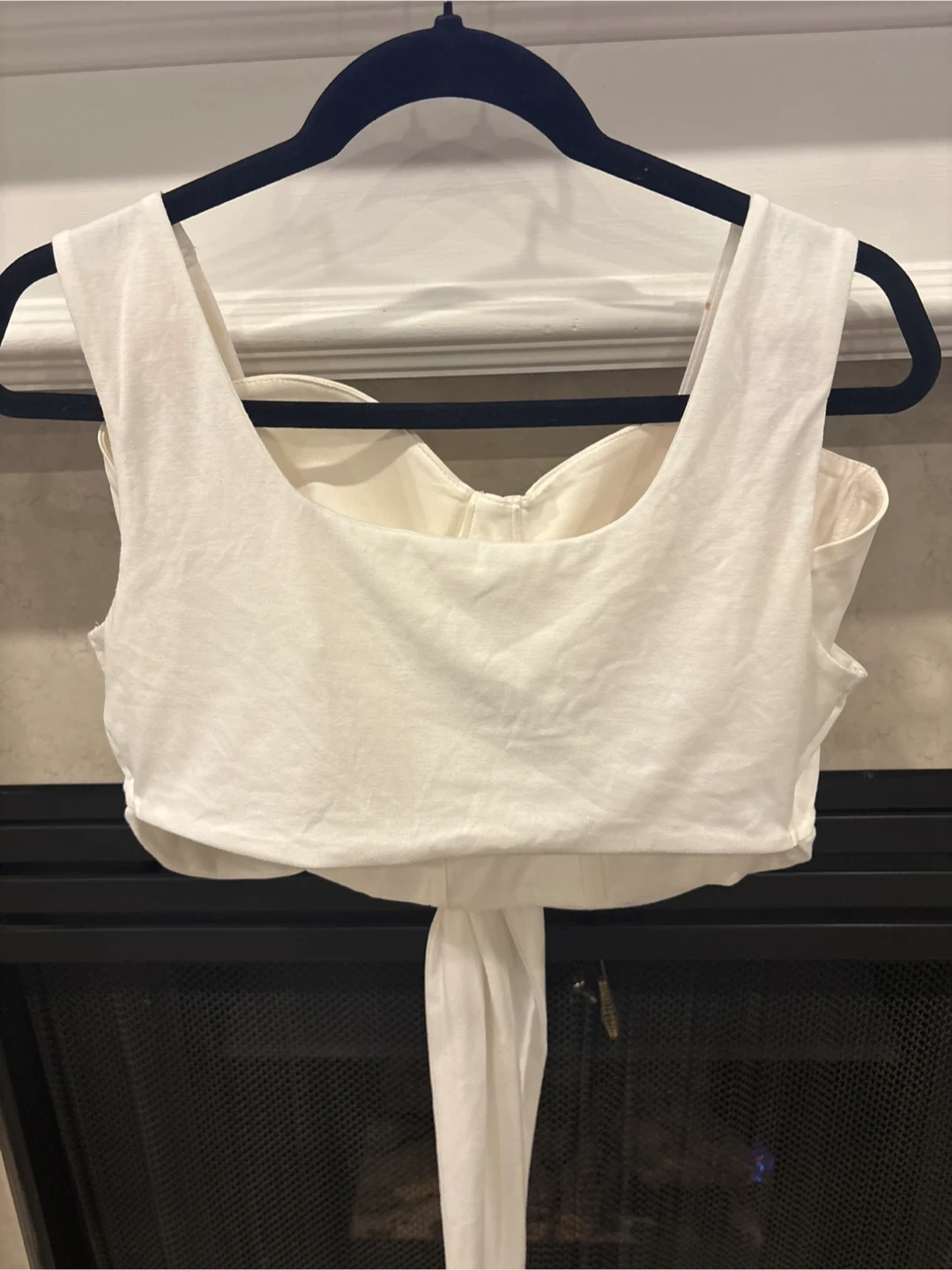 White corset-style top. It's made of a structured fabric with adjustable straps and a tie detail at the front. It features boning for shape.is a set of 2 pc the top is Zara and the cover is cider size L
