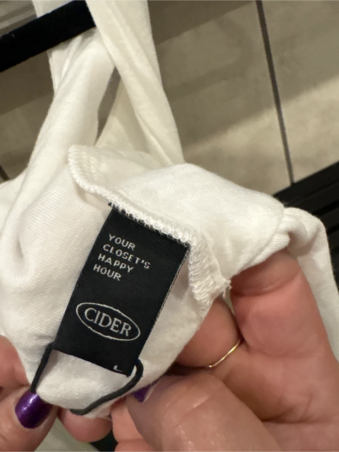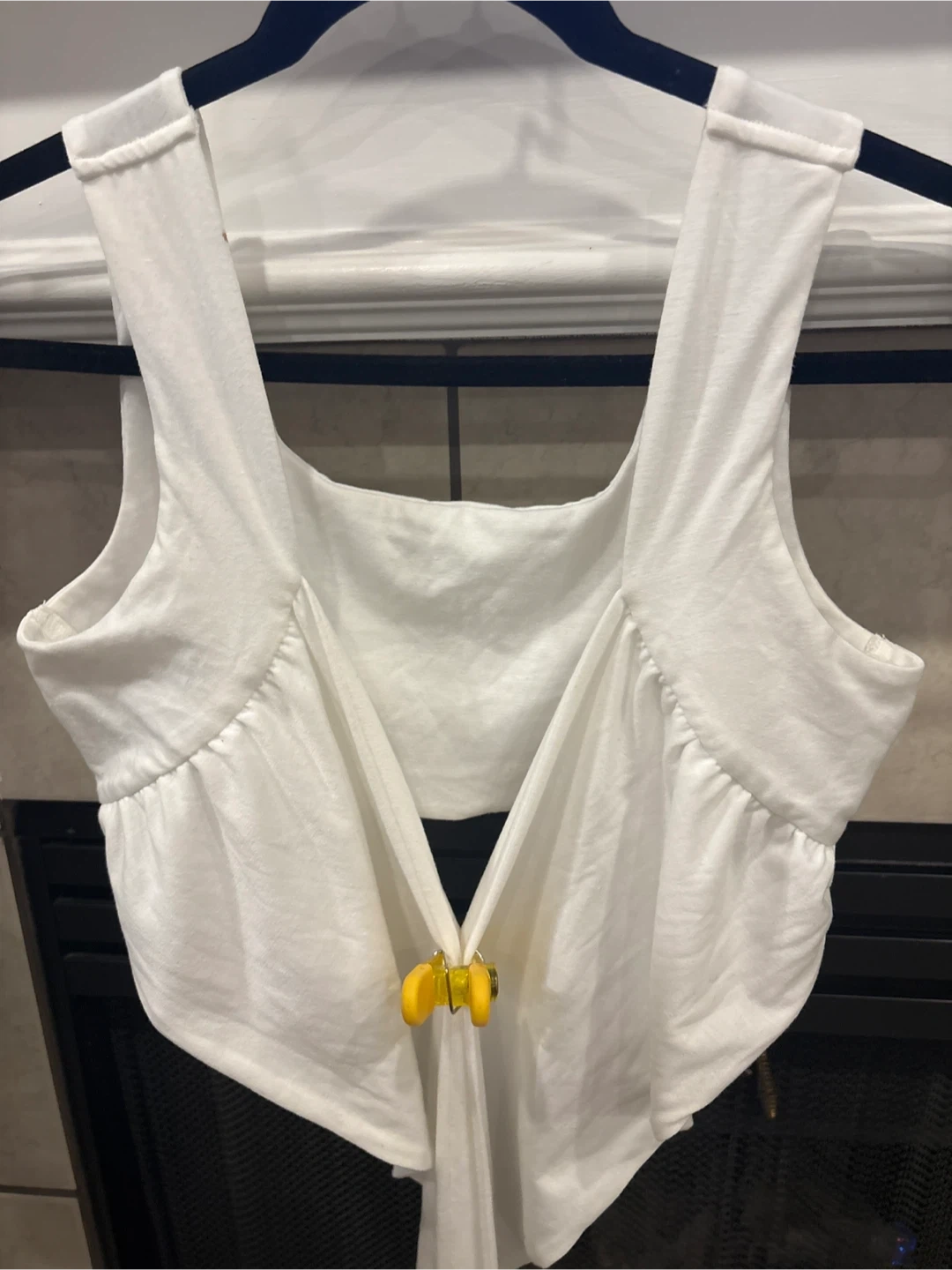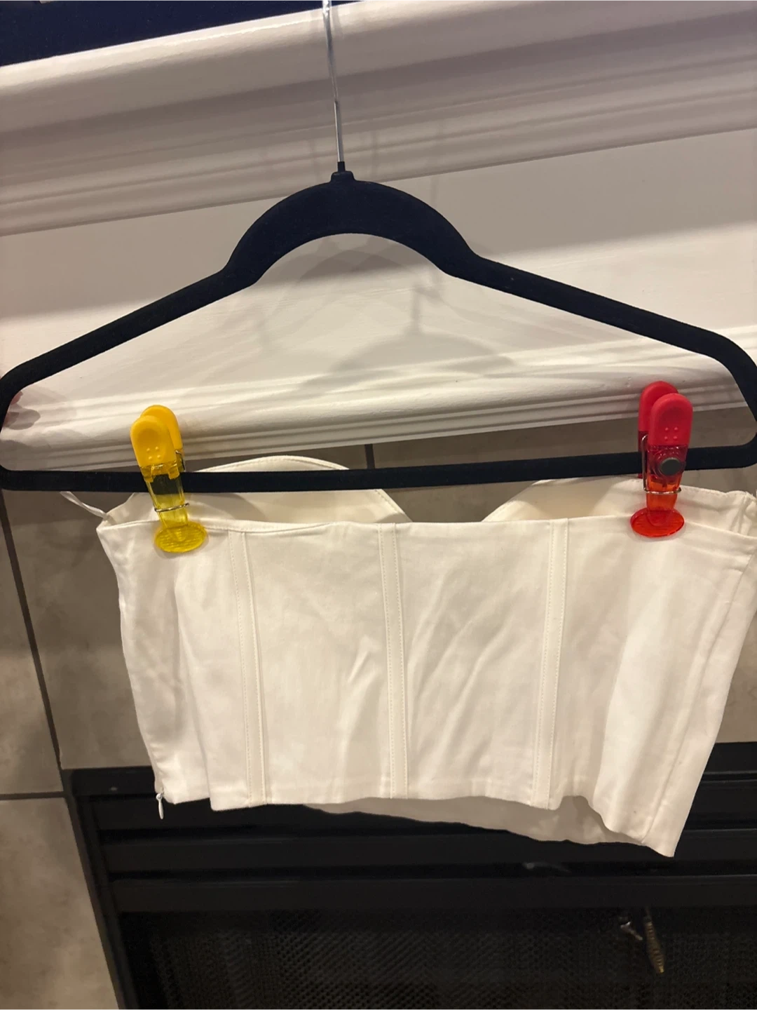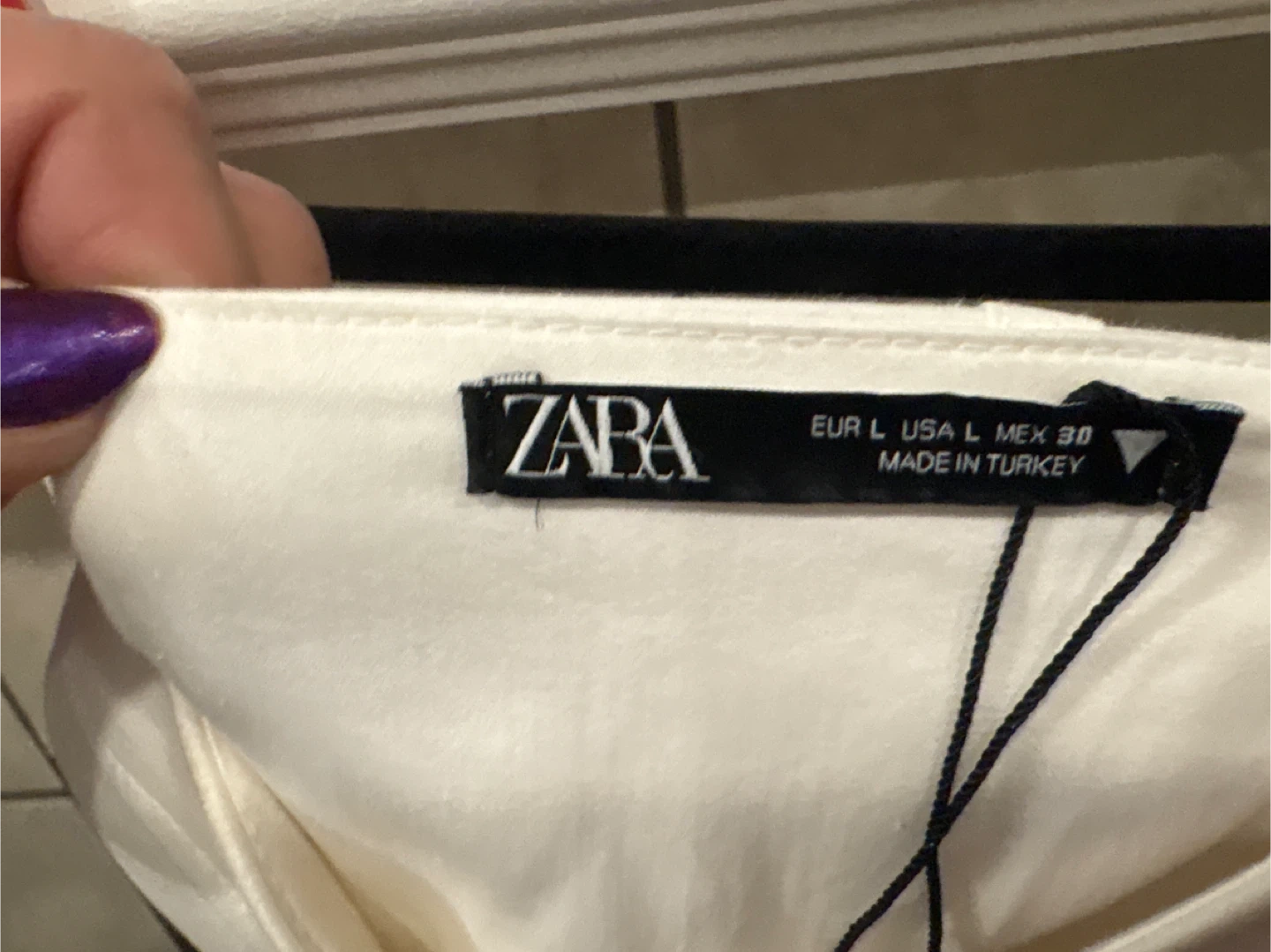 White corset-style top. It's made of a structured fabric with adjustable straps and a tie detail at the front. It features boning for shape.is a set of 2 pc the top is Zara and the cover is cider size L