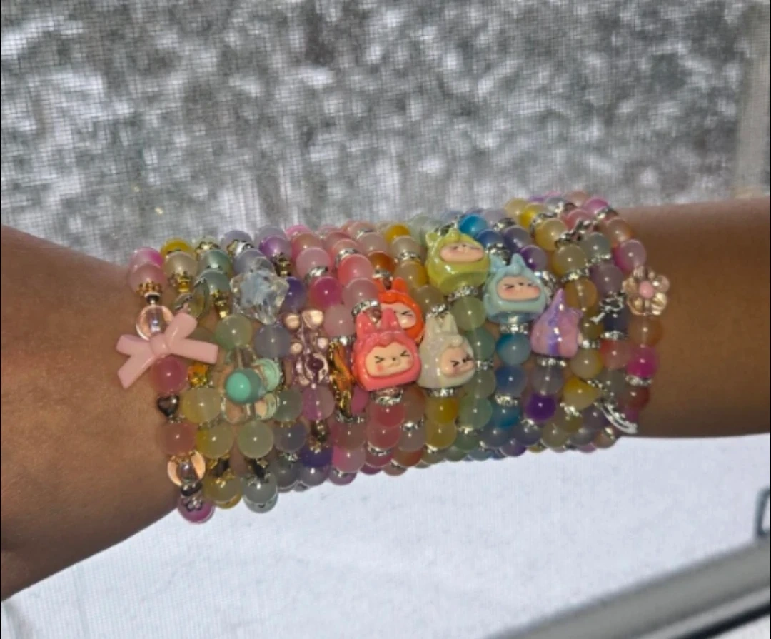 Set of colourful beaded bracelets adorned with cute charms. These bracelets feature a variety of bead colours and playful designs. They're stretchy and comfortable for everyday wear!