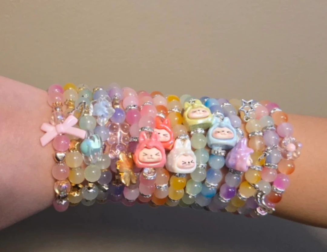 Set of colourful beaded bracelets adorned with cute charms. These bracelets feature a variety of bead colours and playful designs. They're stretchy and comfortable for everyday wear!