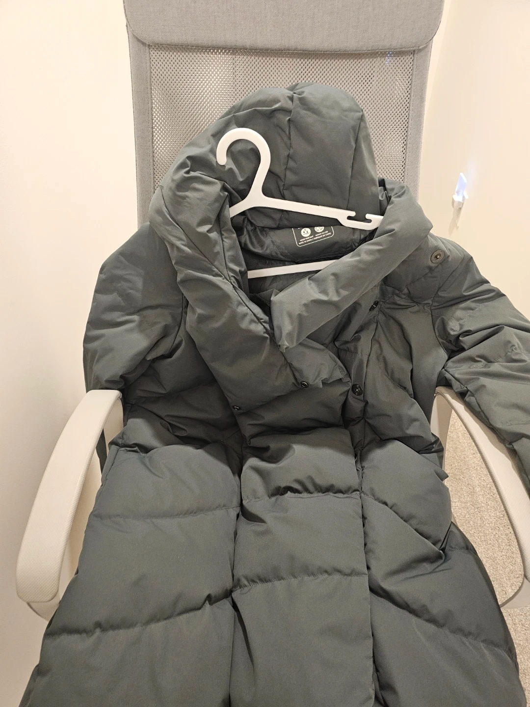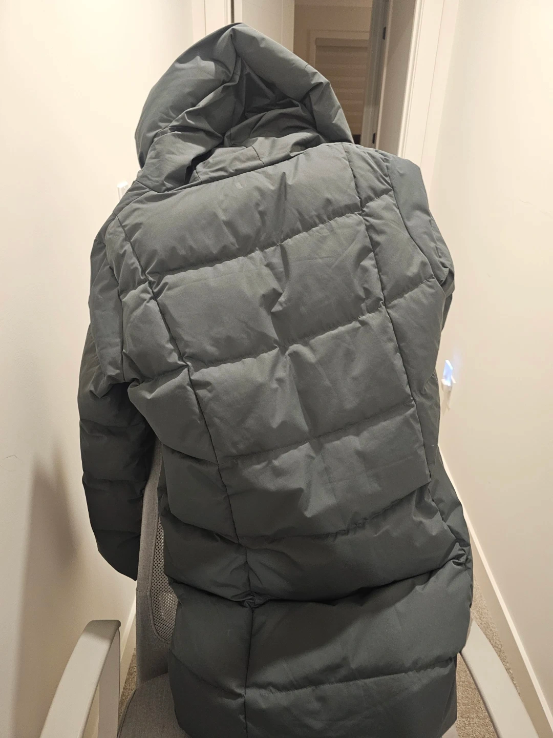 This is a grey quilted down parka from The North Face. It's a warm and stylish winter jacket. It has a hood and front snap closure. Great for staying cozy in the cold!