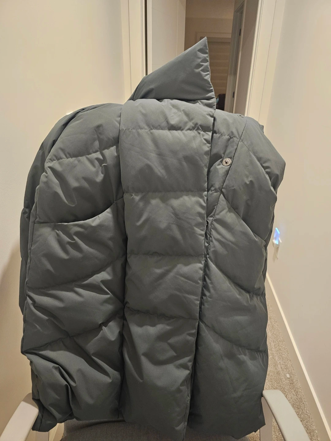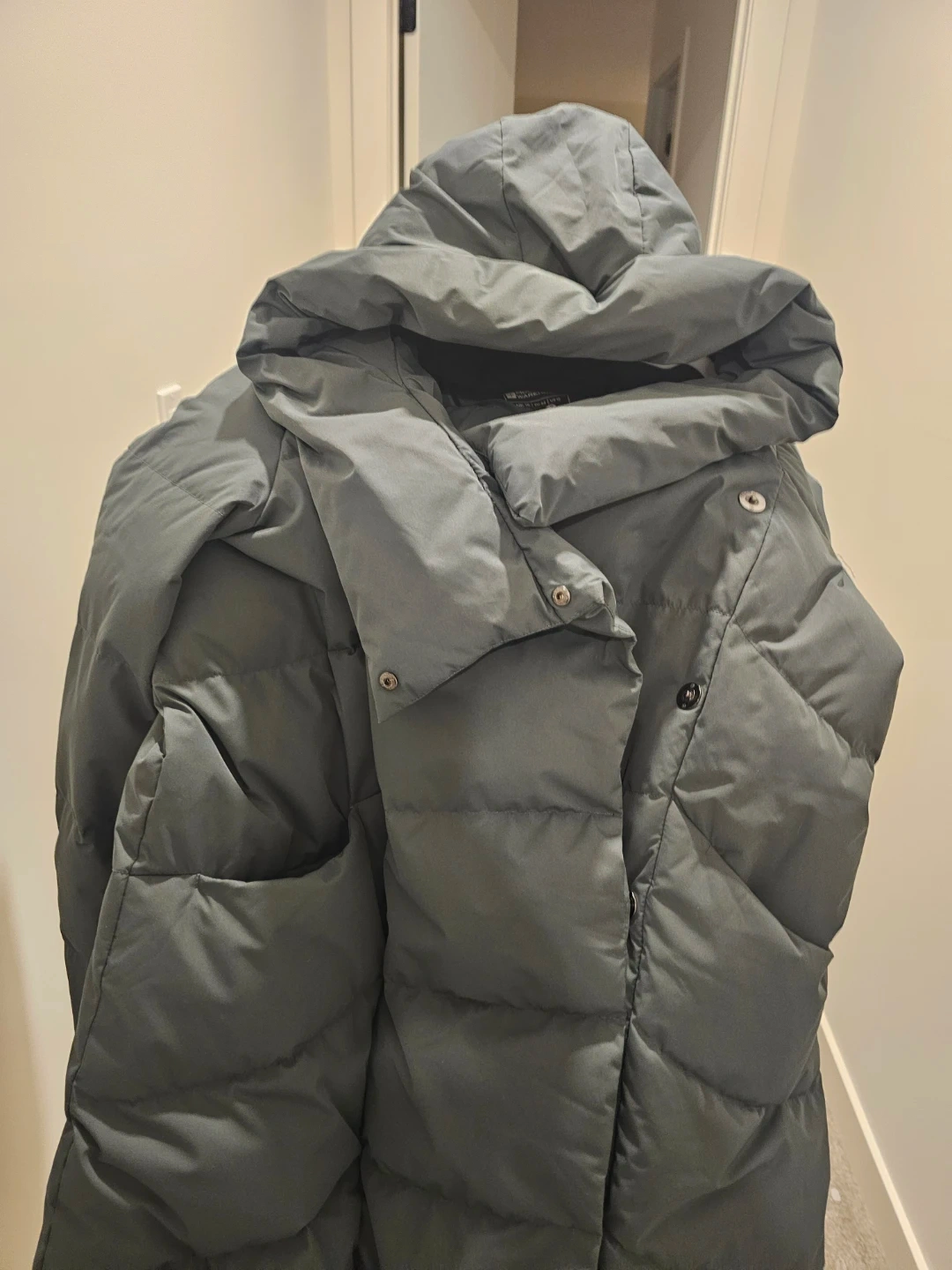 This is a grey quilted down parka from The North Face. It's a warm and stylish winter jacket. It has a hood and front snap closure. Great for staying cozy in the cold!