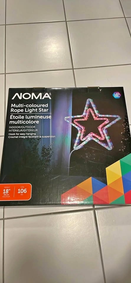 New NOMA multi-coloured rope light star. 18 inches tall with 106 LEDs. Great for indoor or outdoor decor. Has hook for easy hanging.