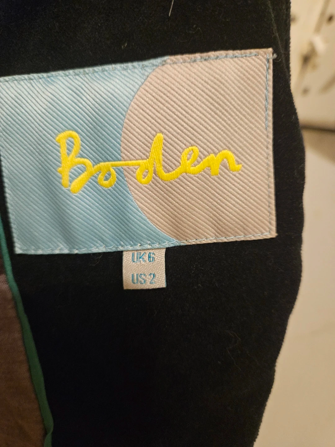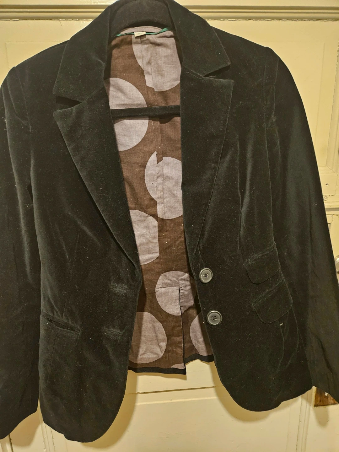Boden black velvet blazer and matching pants suit. Outer shell is 100% Cotton Velvet. Body lining is 100% Cotton. Sleeve lining is 100% Polyester Taffeta. This outfit would be great for a night out or a special occasion!