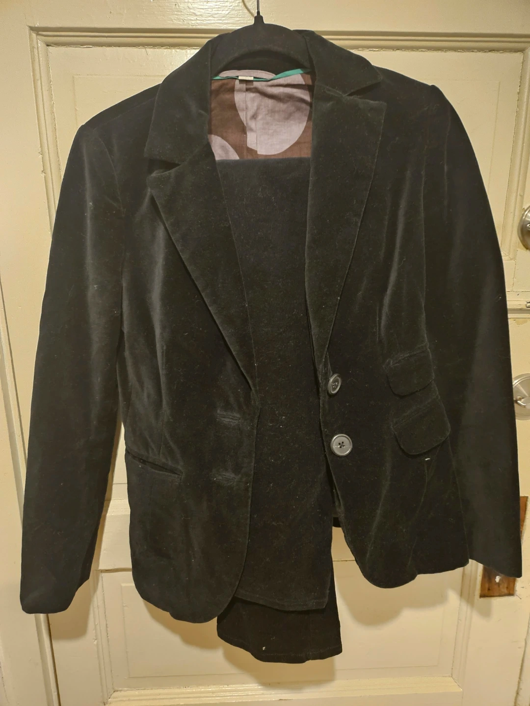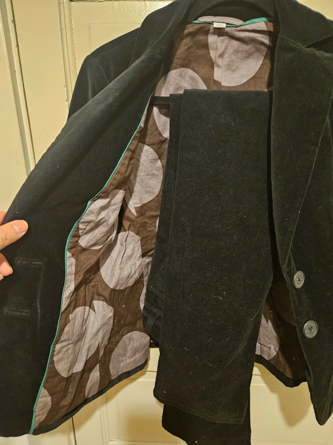 Boden black velvet blazer and matching pants suit. Outer shell is 100% Cotton Velvet. Body lining is 100% Cotton. Sleeve lining is 100% Polyester Taffeta. This outfit would be great for a night out or a special occasion!