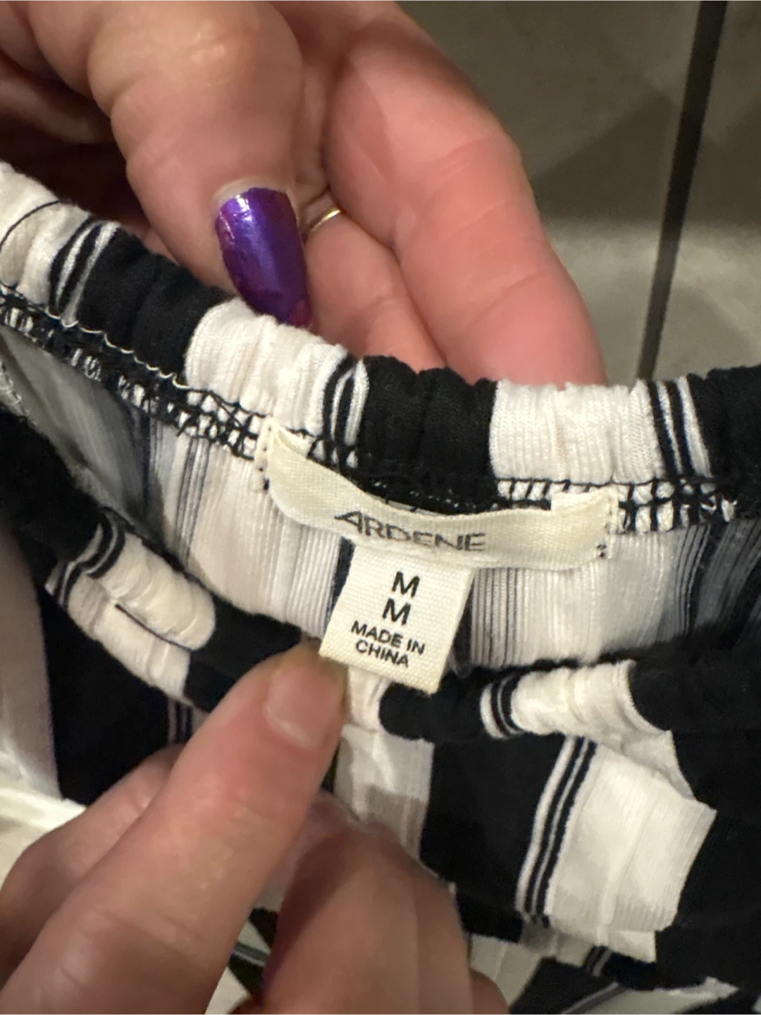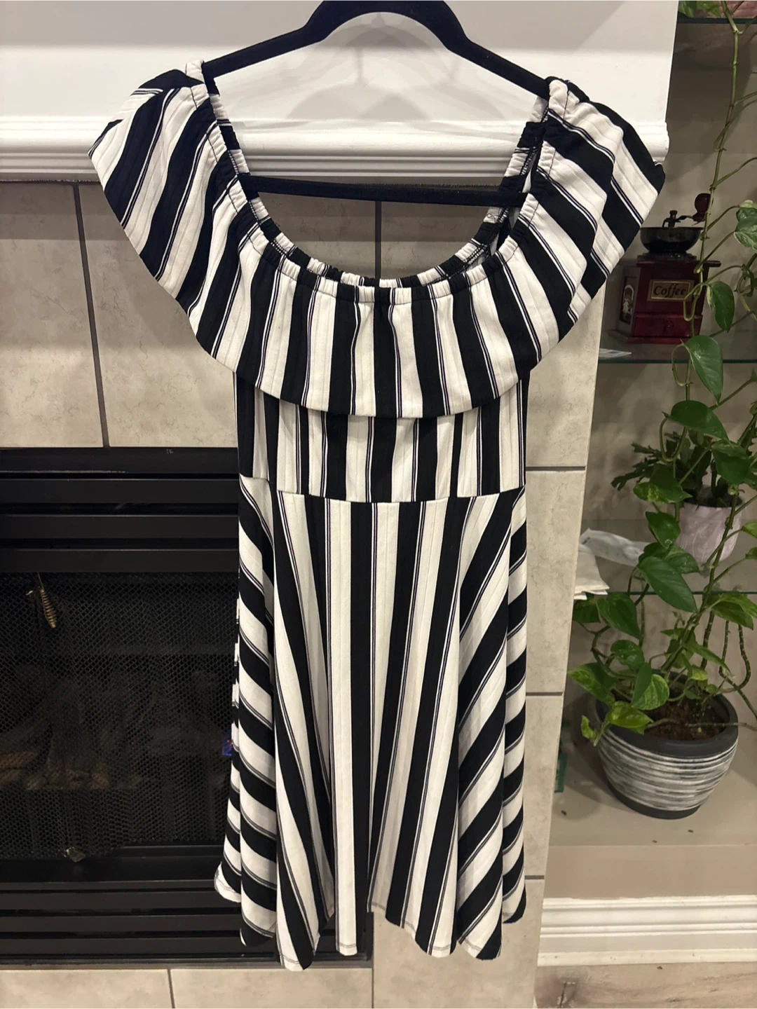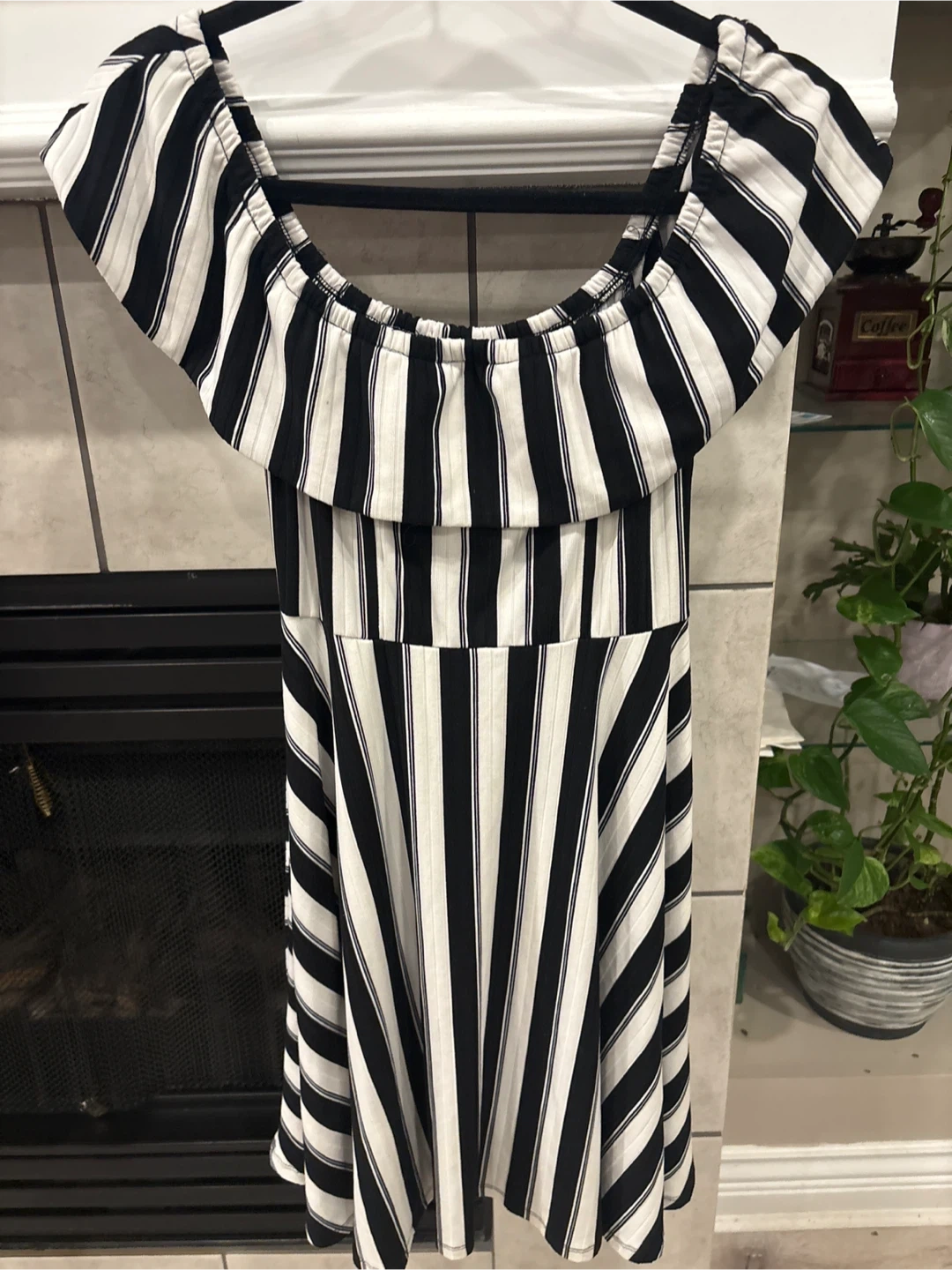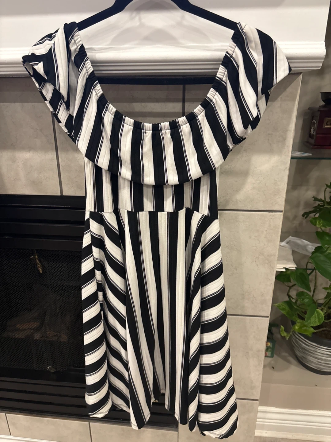 This Ardene dress is a size medium. It's black and white striped with an off-the-shoulder design. The dress is size medium perfect for summer or any occasion
