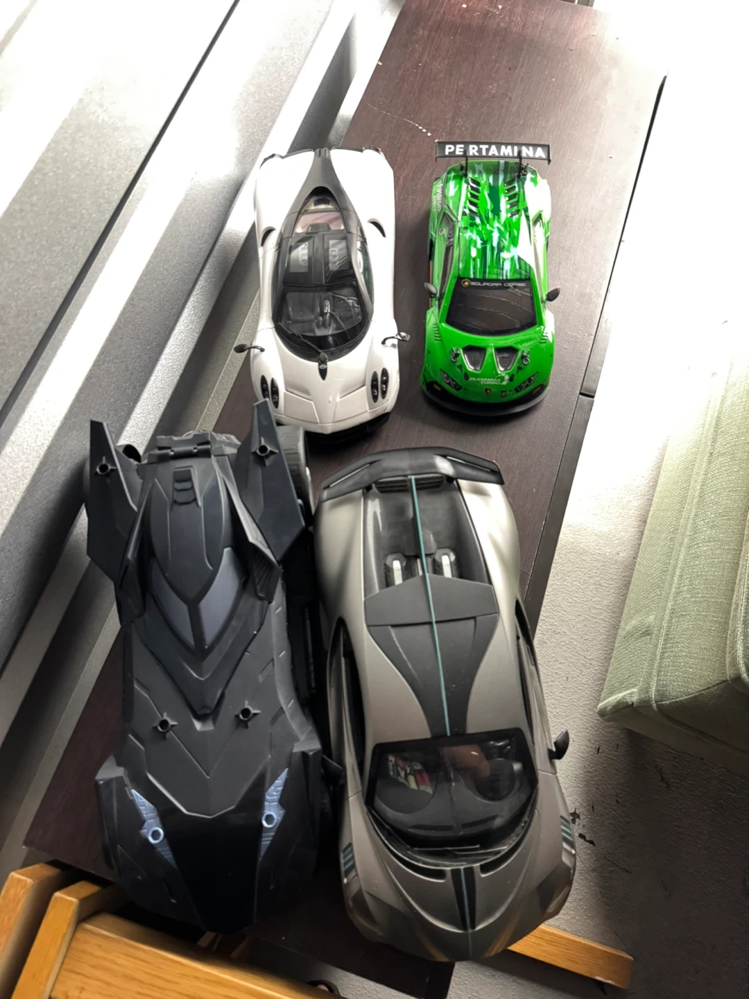 This listing includes two die-cast toy sports cars, one white and one green. The green car features 'PERTAMINA TURBO' branding and 'SQUADA CORSE' text. These are detailed models for collectors or play.
