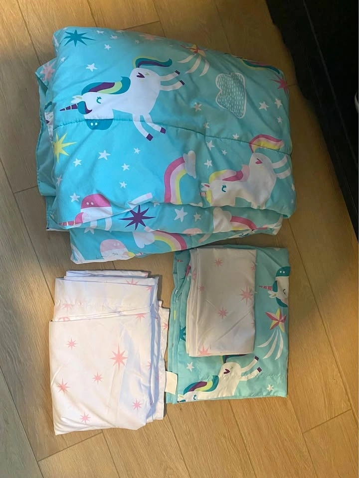 Very cute unicorn and star themed bedding set. Includes one unicorn pillow sham, one star pillow case, one flat sheet with stars, and one twin bed quilt with a unicorn. Porch pickup in Lynn Valley.