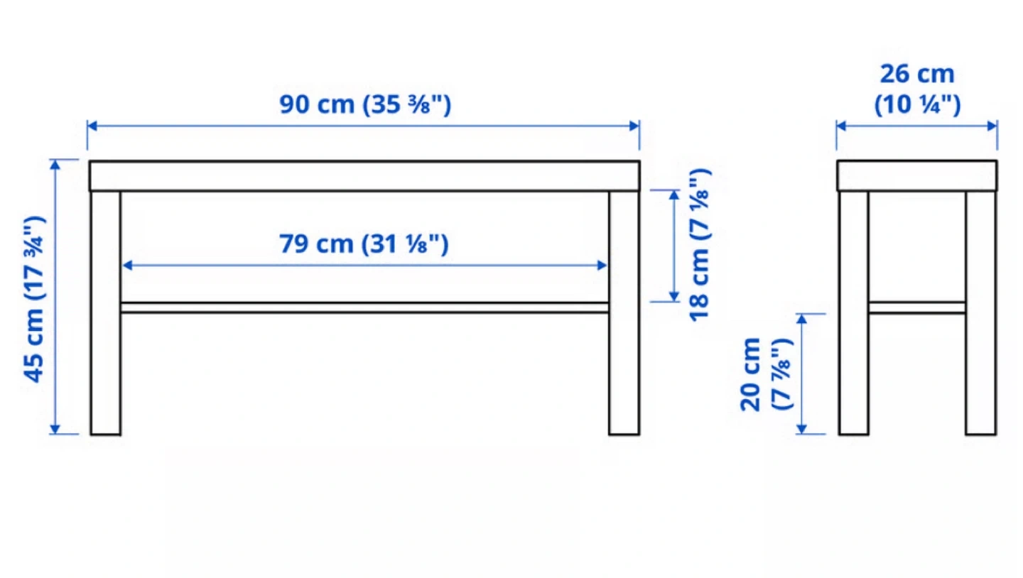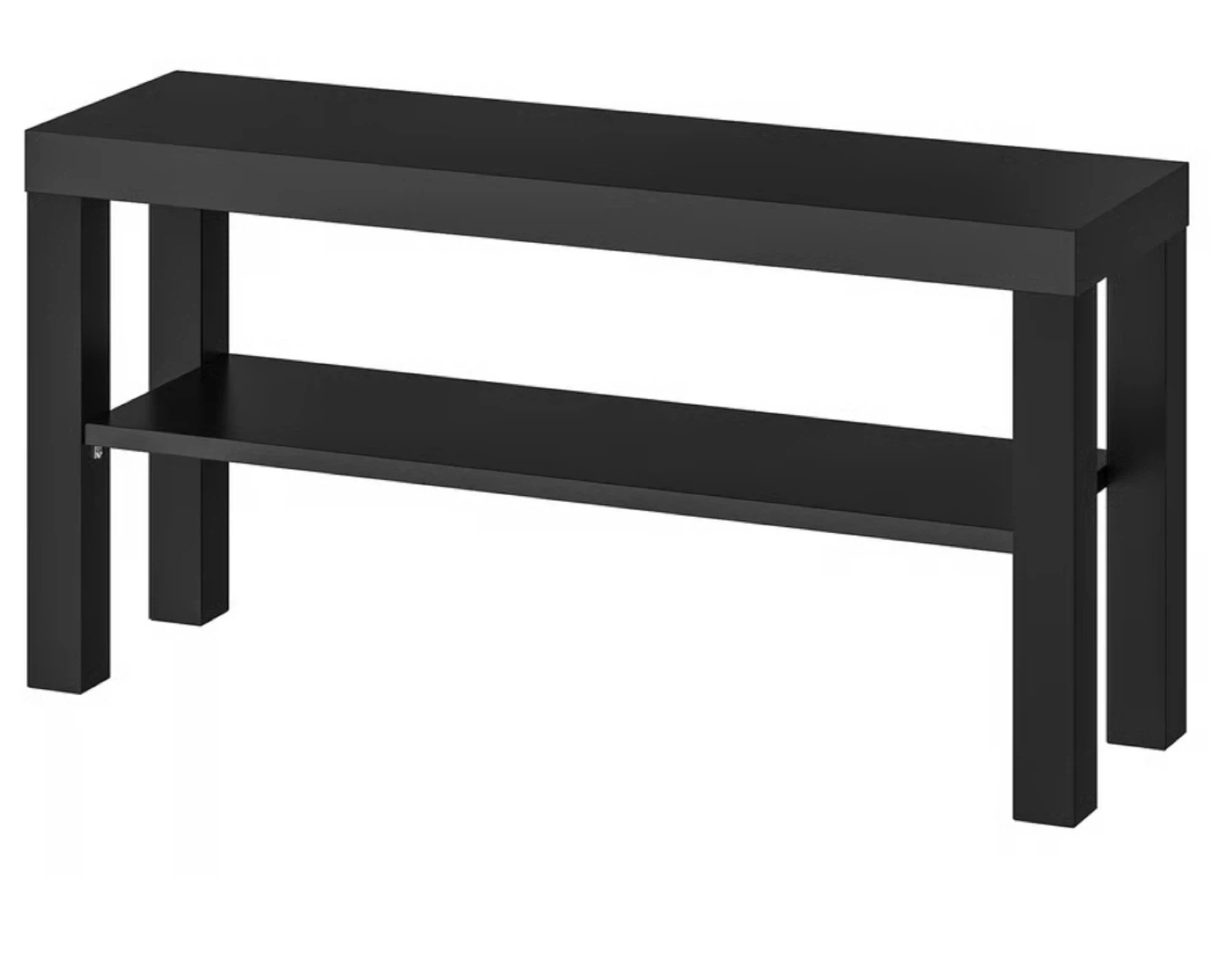 This is a black console table with a lower shelf. It's 90 cm wide, 45 cm tall, and 26 cm deep. The shelf is 18 cm from the bottom.