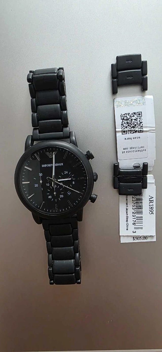 Gently used Emporio Armani AR1895 all-black stainless steel chronograph men's watch. Worn only once and in excellent condition with original tags attached. The original box is currently unavailable, but I will provide it if I can locate it.