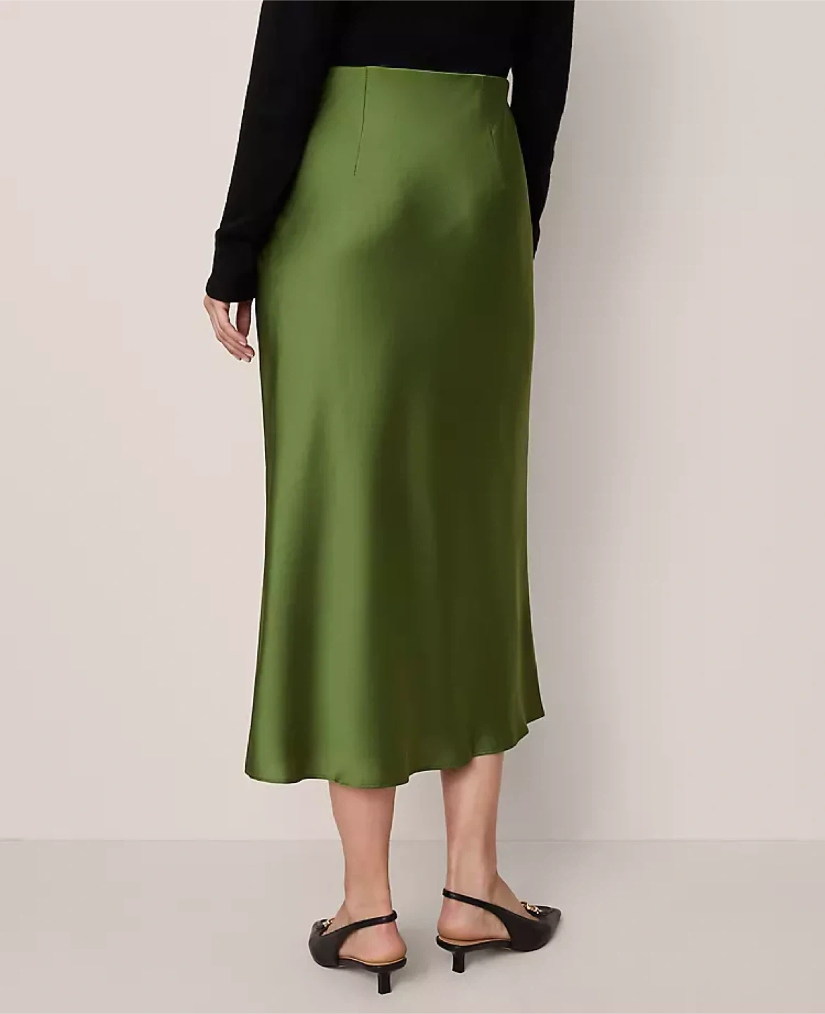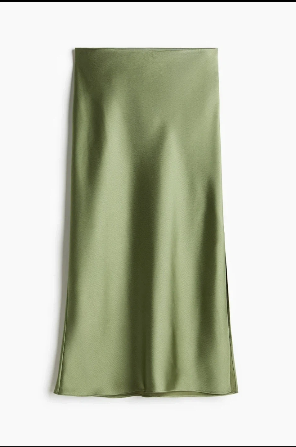 This H&M crêpe satin skirt comes in a light khaki green colour. It's made from a satin material and has a midi length. This skirt is perfect for dressing up or down has a stretchy fit