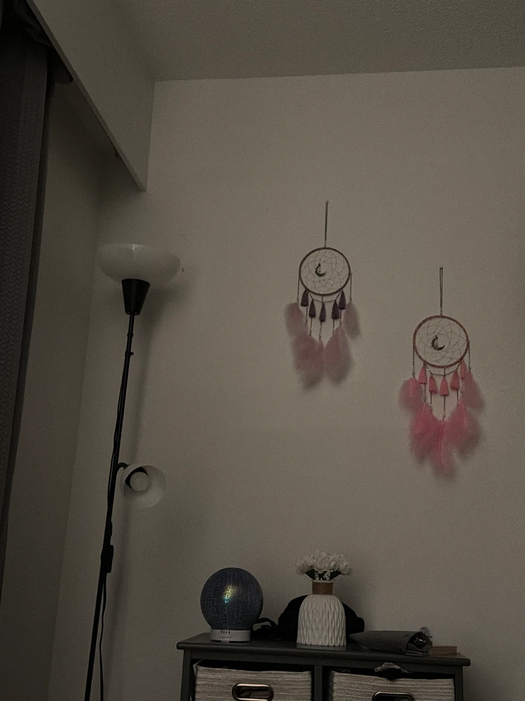 Two beautiful dreamcatchers, perfect for adding a touch of boho charm to any room. One features pink feathers, the other has purple accents. They're approximately 8 inches in diameter.