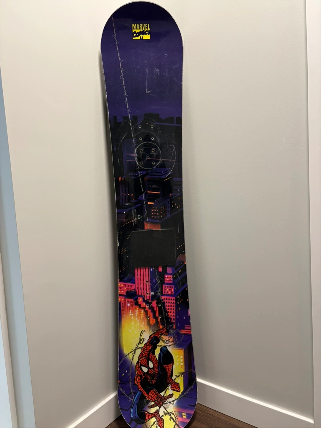 This is a Marvel Comics snowboard featuring Spiderman. It's designed with a city skyline and Spiderman graphic. Ideal for young riders starting out!