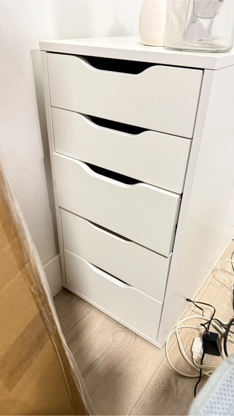 White 5-drawer Alex filing cabinet. Great for storing office supplies or craft materials. Unit dimensions are approximately 30" tall, 14" wide, and 18" deep.