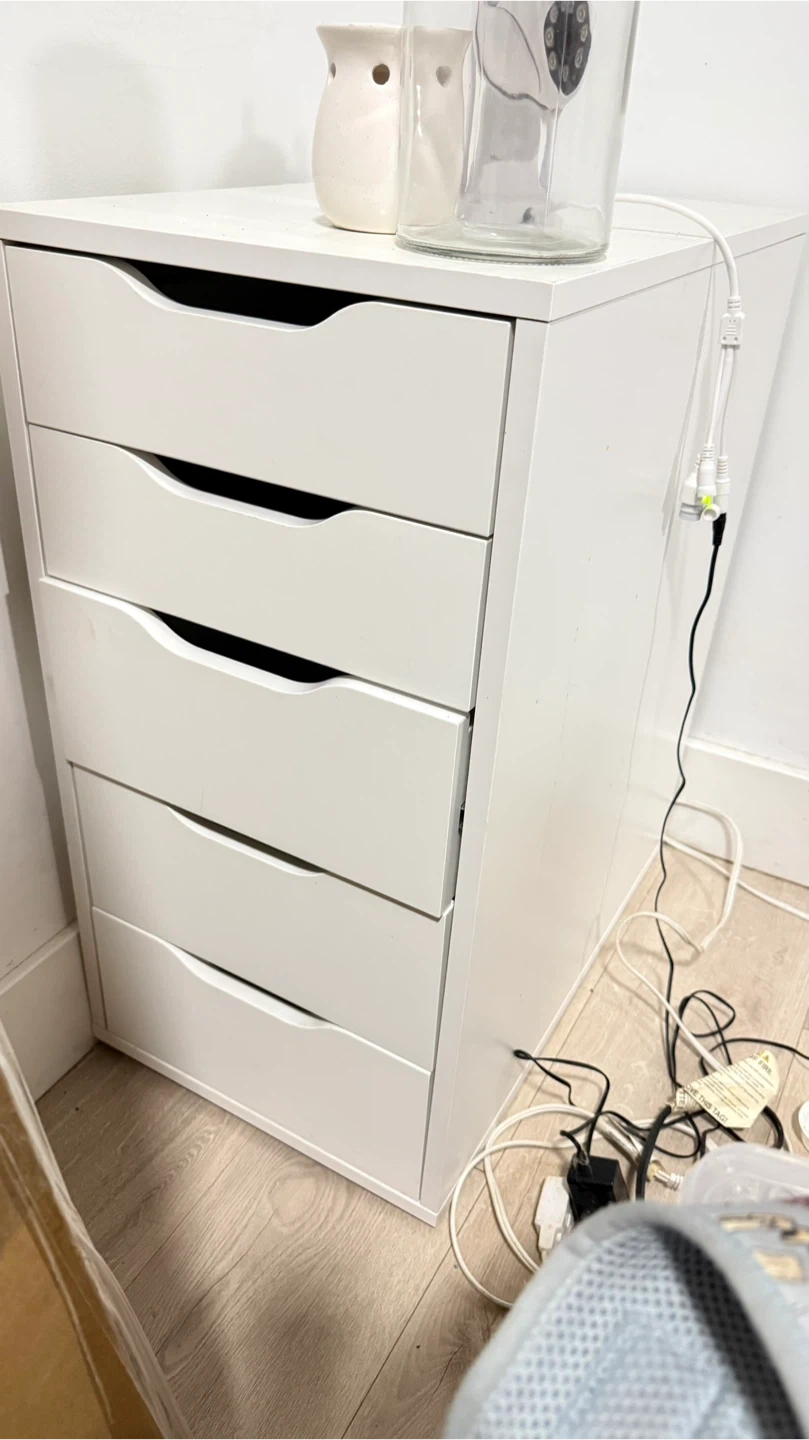 White 5-drawer Alex filing cabinet. Great for storing office supplies or craft materials. Unit dimensions are approximately 30" tall, 14" wide, and 18" deep.