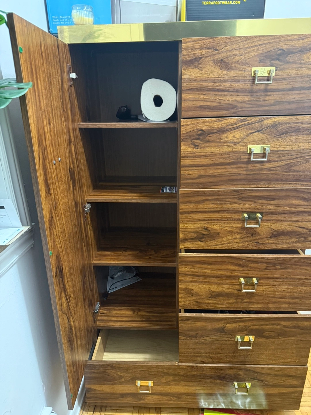 This dresser features a rich wood grain finish with elegant gold hardware. It includes one large cabinet with shelves and multiple drawers for ample storage. The compact design is suitable for bedrooms or entryways.