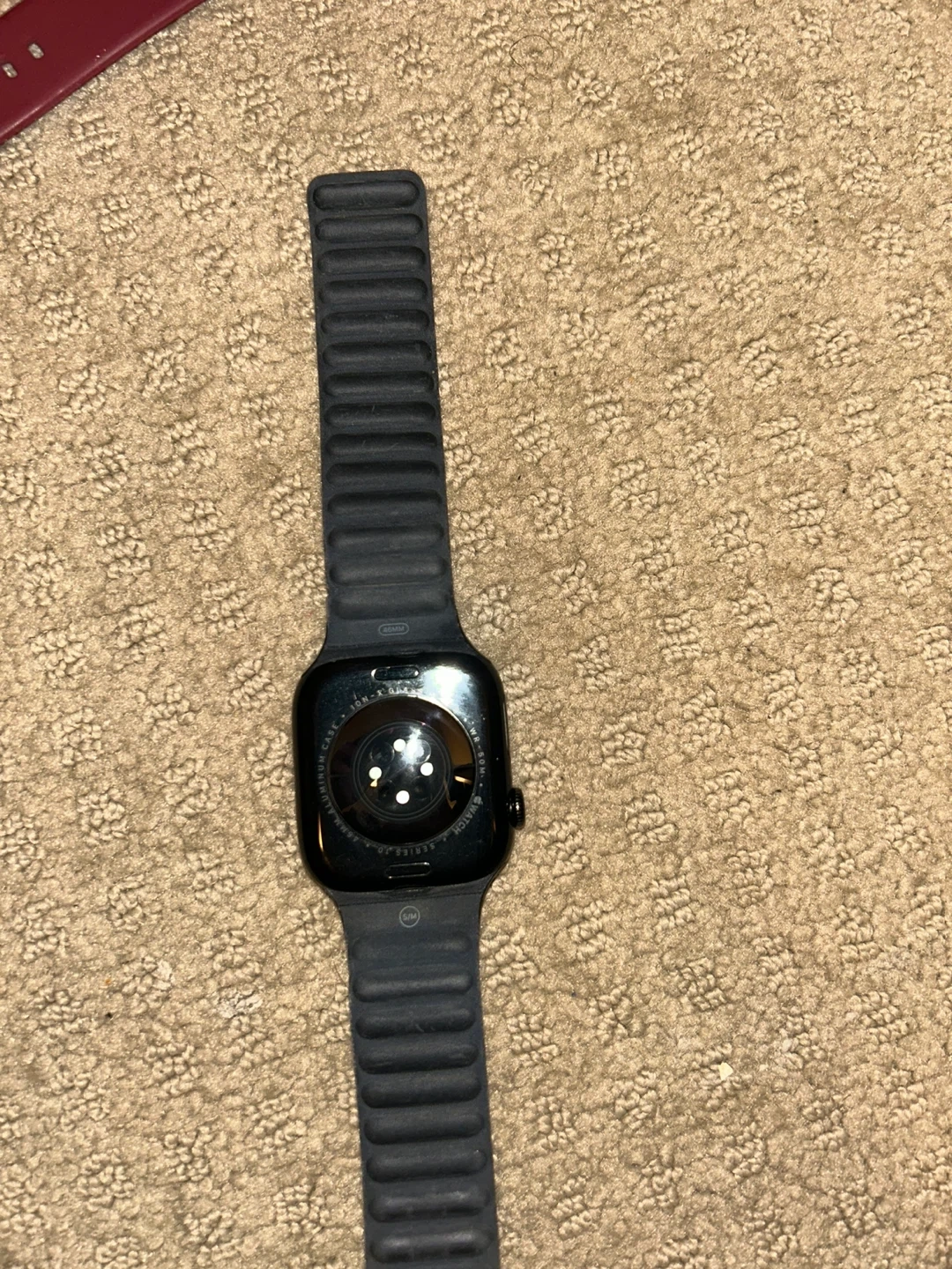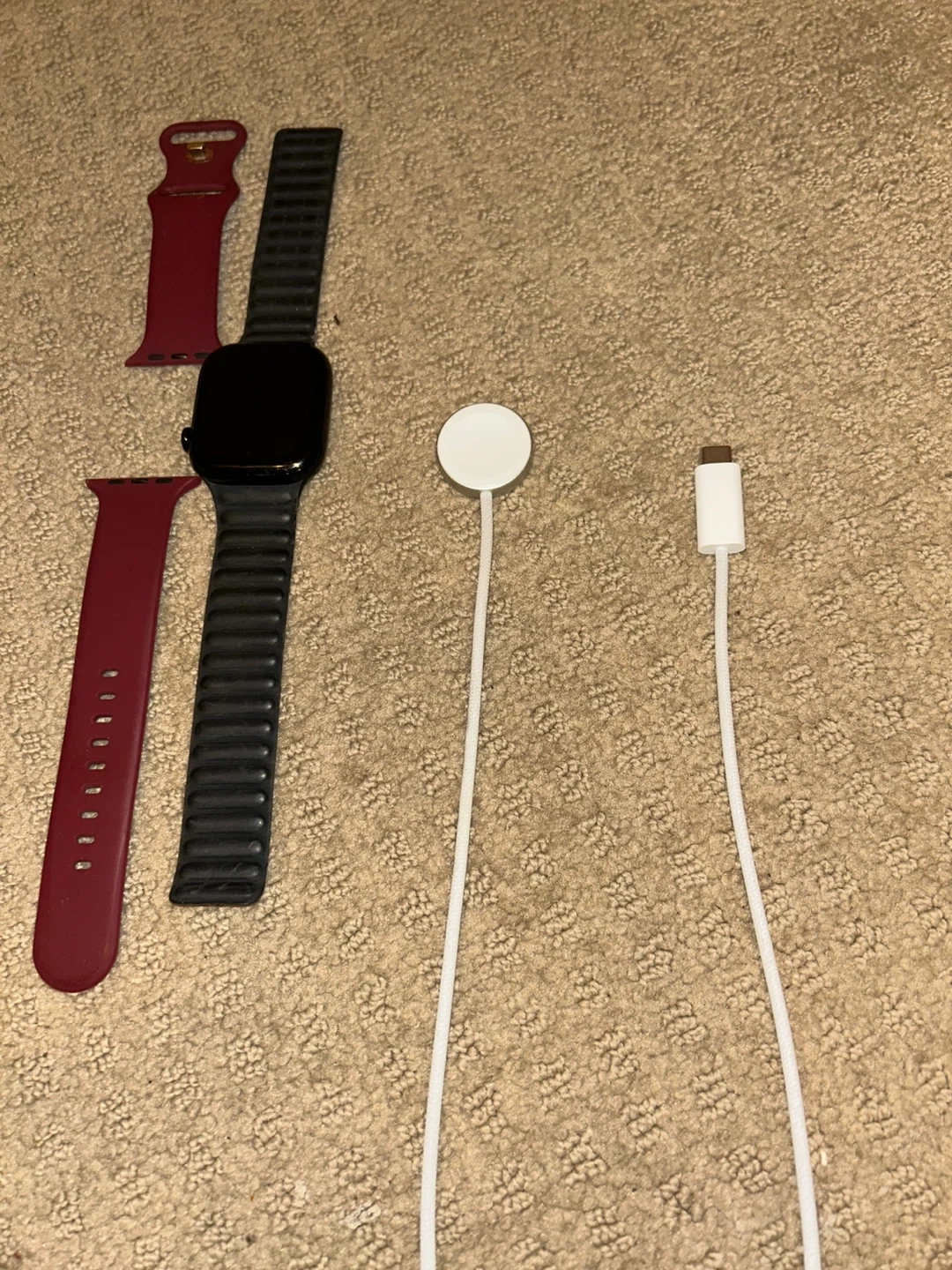 This is an Apple Watch Series 10 in black with a black sport band. It comes with a magnetic charging puck and USB-C cable. Also includes two additional red sport bands.