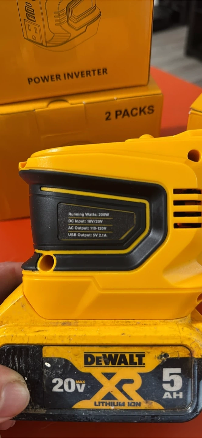 This power inverter offers 200W running watts, DC input of 18V/20V, DC output of 120V, and USB output of 5V/2.1A. It's a handy tool for providing power on the go. This item is yellow and black.