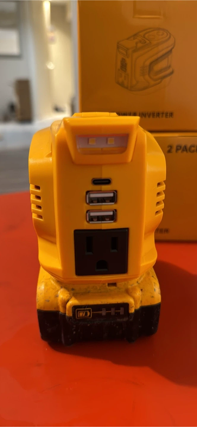 This power inverter offers 200W running watts, DC input of 18V/20V, DC output of 120V, and USB output of 5V/2.1A. It's a handy tool for providing power on the go. This item is yellow and black.