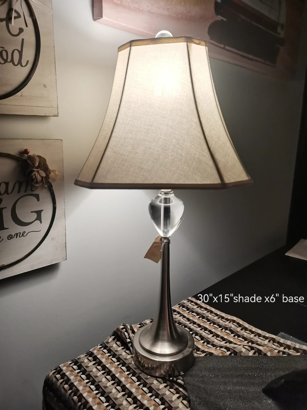 Add a touch of elegance to any room with this sophisticated table lamp, featuring a 30" height, a 15" lampshade, and a 6" base. This lamp is in used, but good condition, ready to brighten your space with its soft glow.