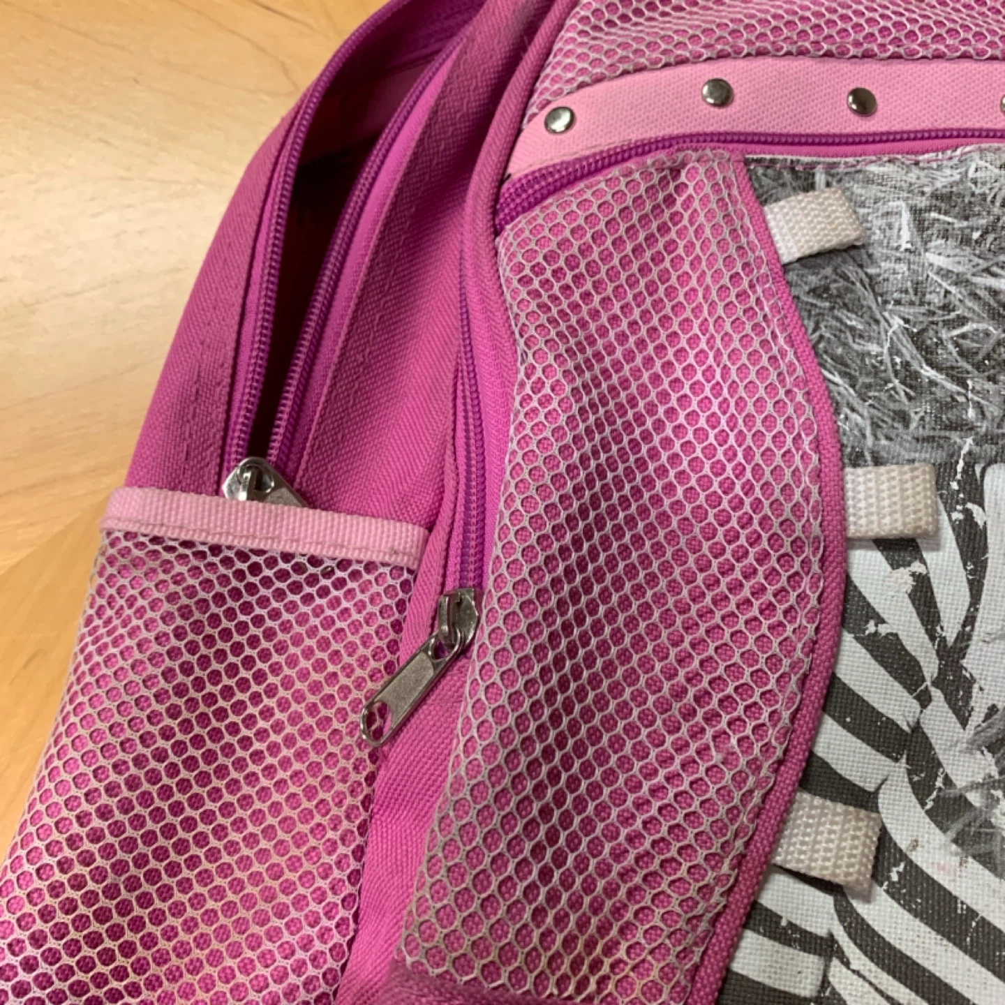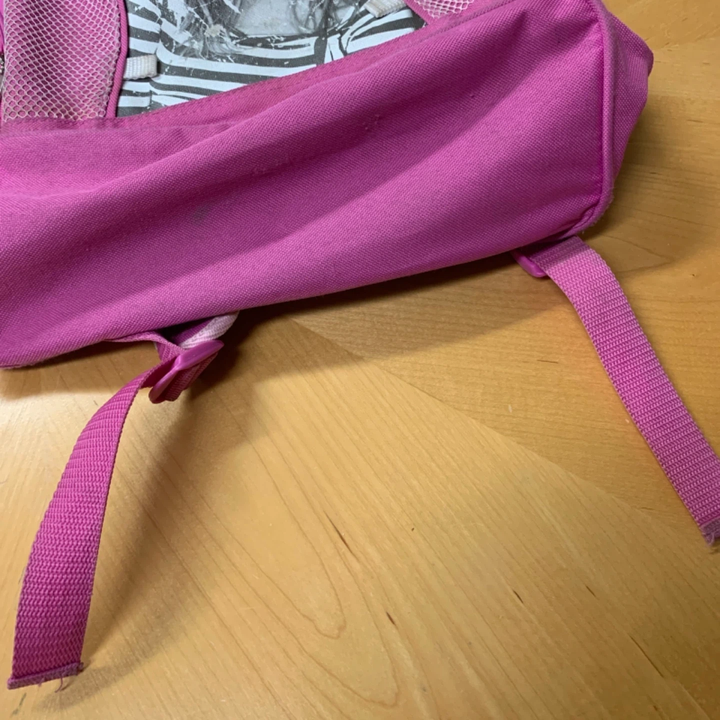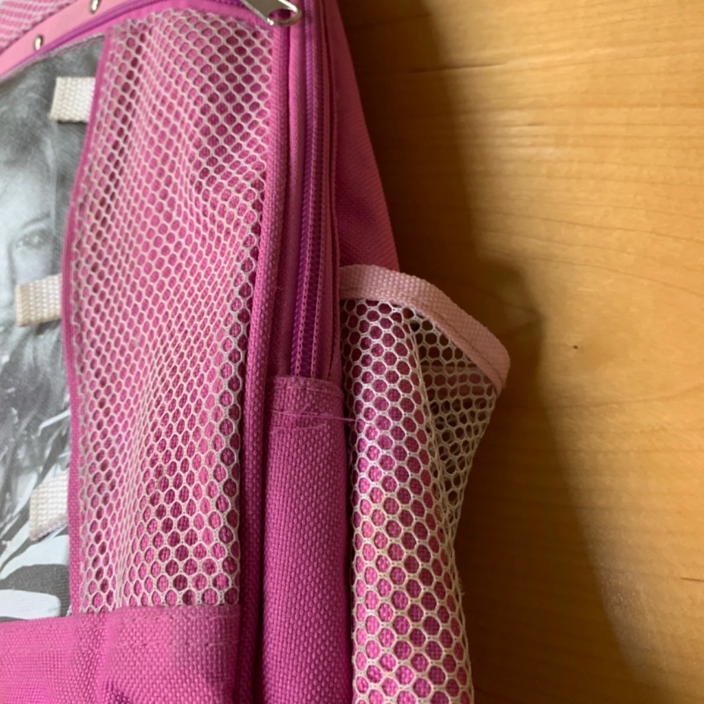 Pink backpack featuring a mesh front pocket and side pockets. It has a large graphic print of a celebrity on the front. Zipper closure is functional.