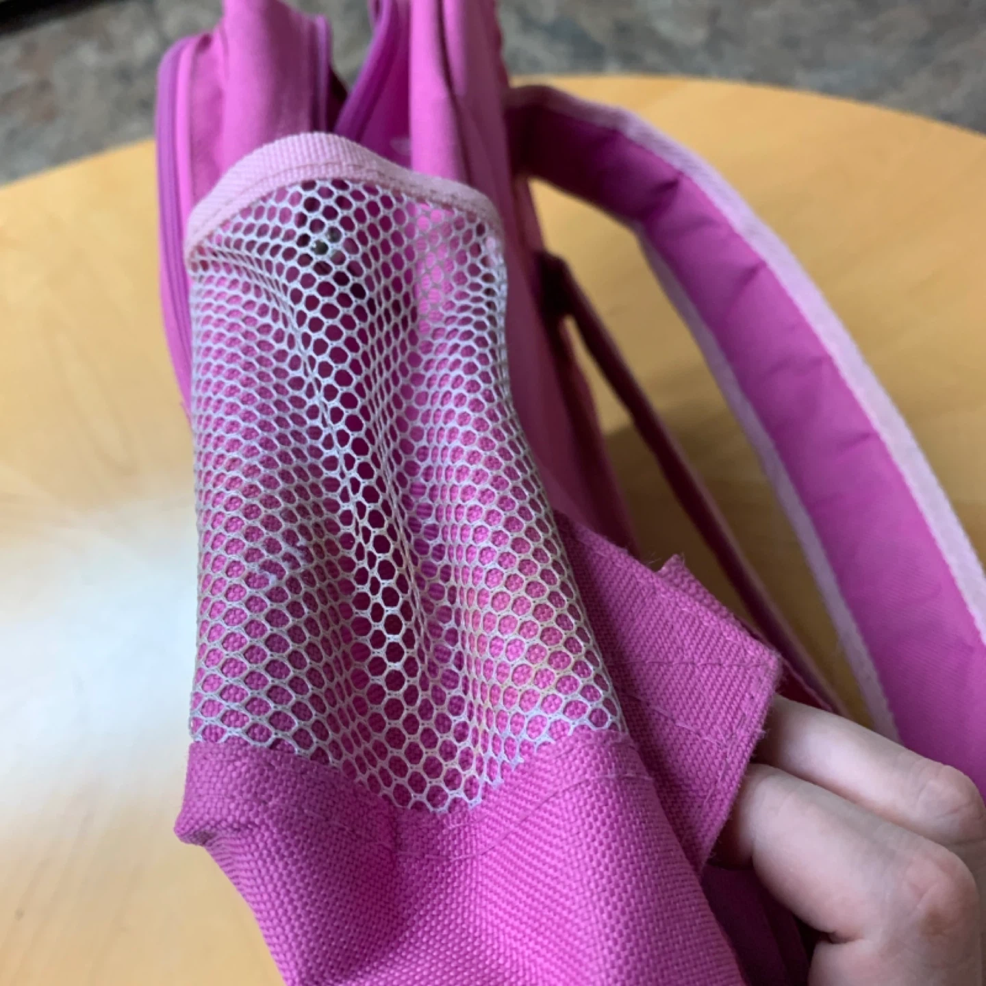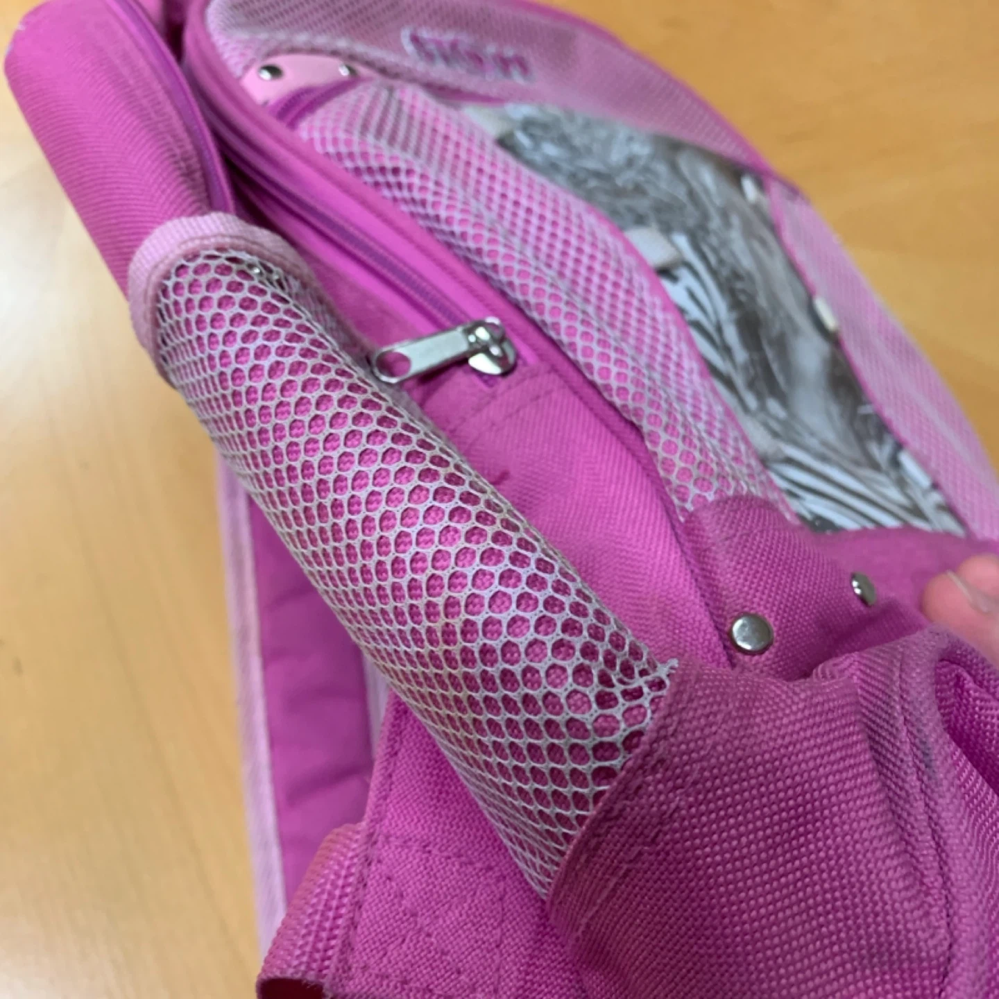 Pink backpack featuring a mesh front pocket and side pockets. It has a large graphic print of a celebrity on the front. Zipper closure is functional.