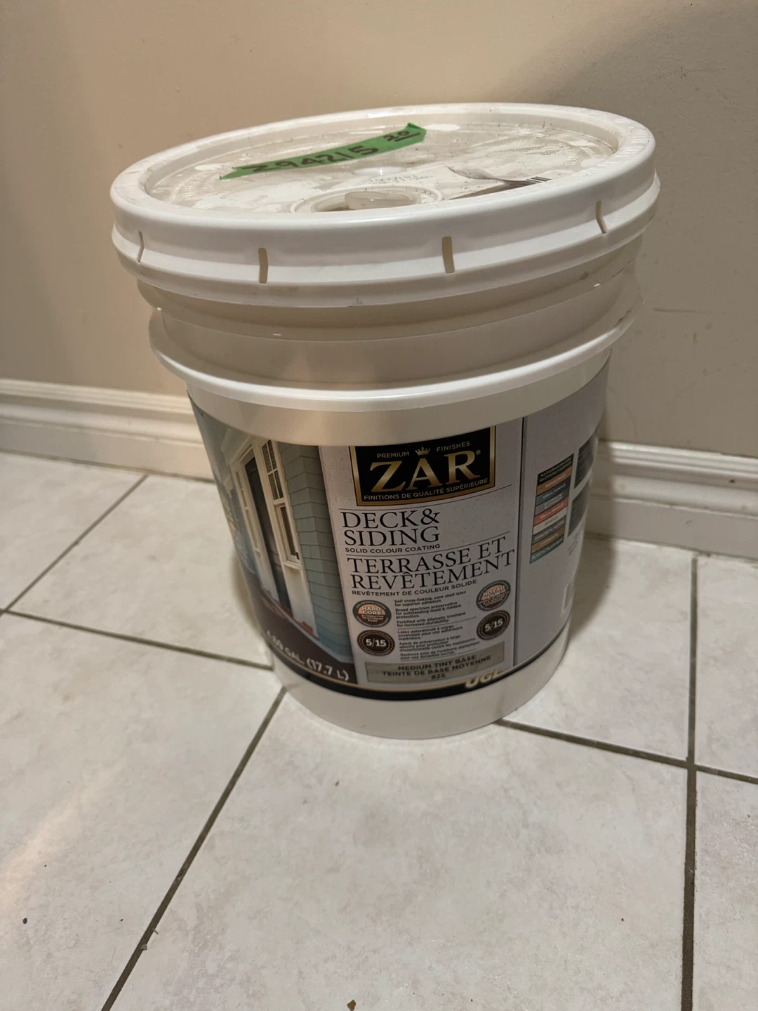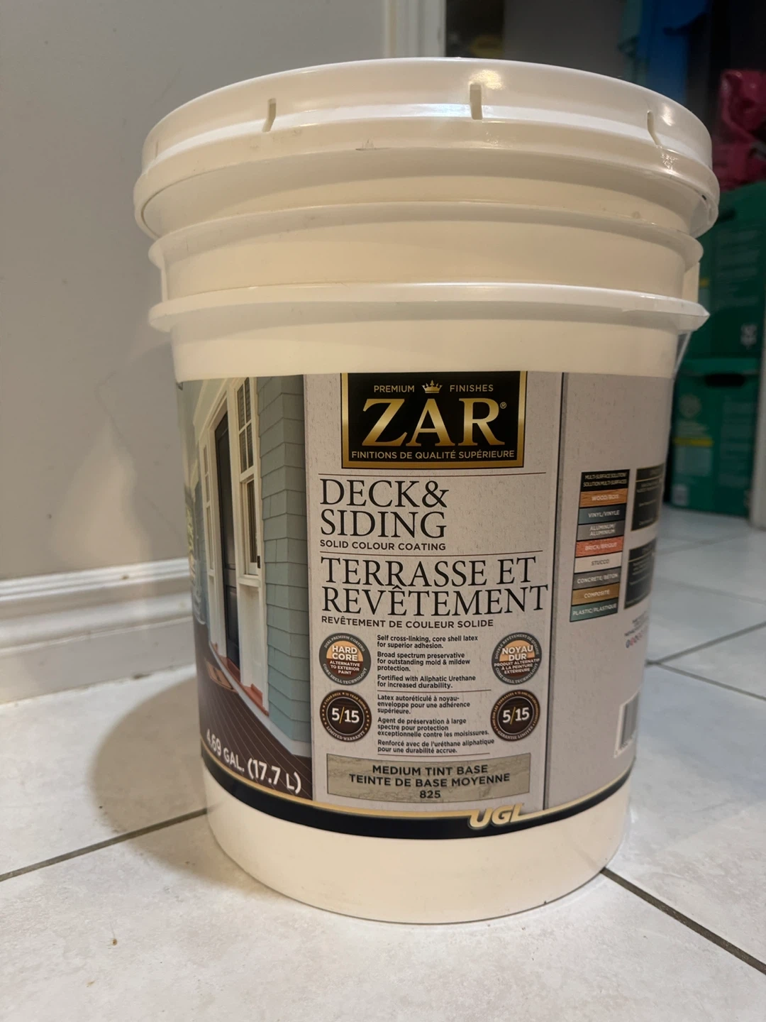 ZAR Deck & Siding Solid Colour Coating in Medium Tint Base. This solid colour coating is designed for decks and siding. It's a 5 gallon container. Hard surface technology for superior adhesion. Novel urethane for increased durability.