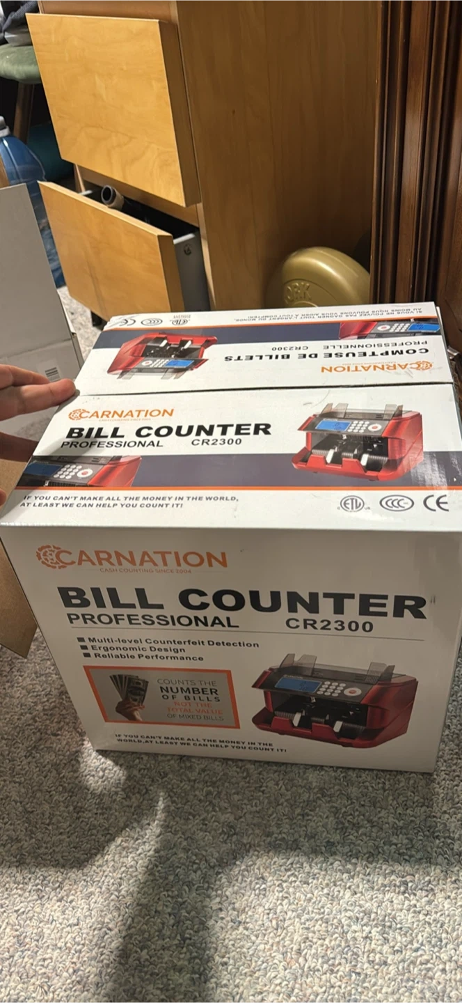 Carnation CR2300 professional bill counter. Counts the number of bills of mixed bills. Features multi-level counterfeit detection and reliable performance. This is useful for businesses that handle a lot of cash.