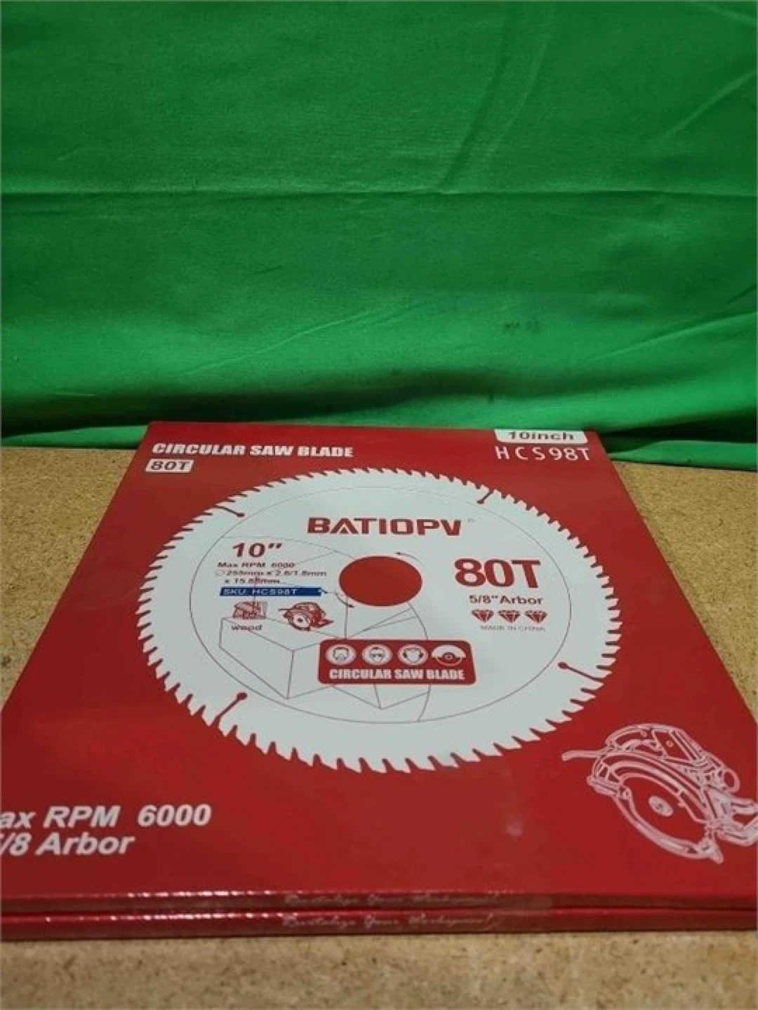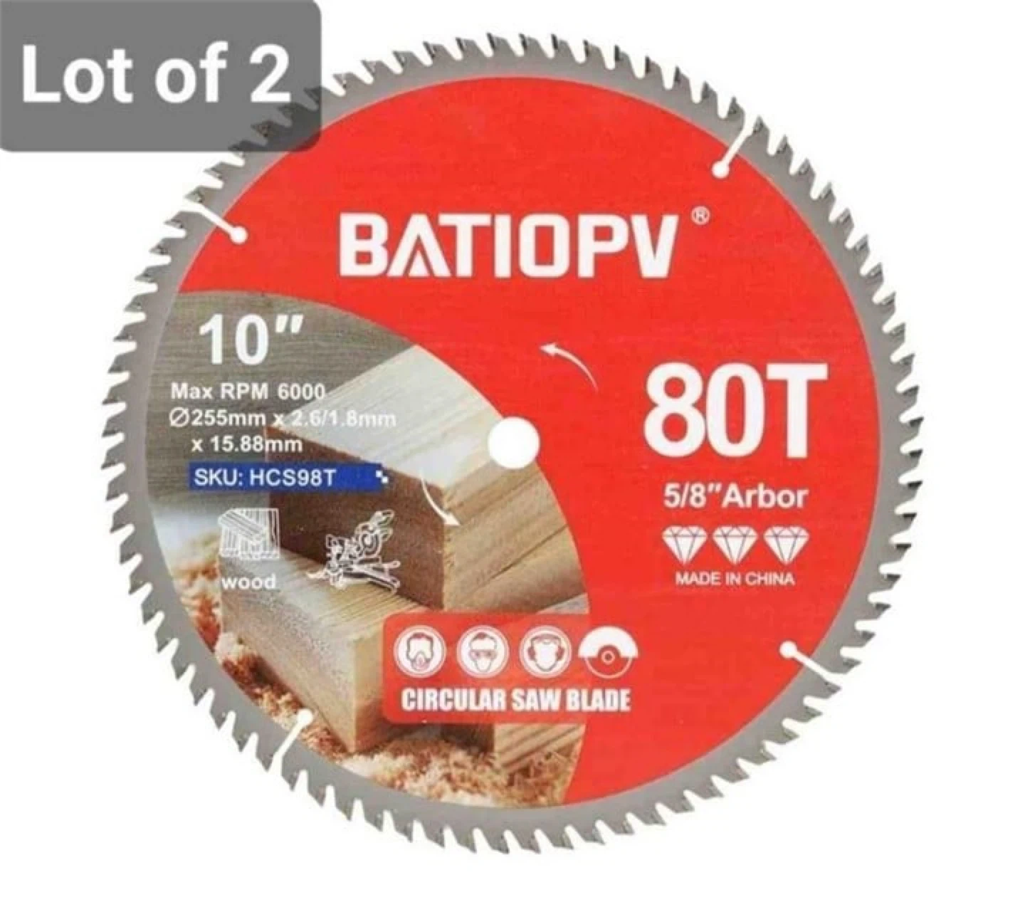 This is a Batiopv 10-inch circular saw blade with 80 teeth. It features a 5/8" arbor and a max RPM of 6000. This blade is designed for wood cutting. It's made in China.