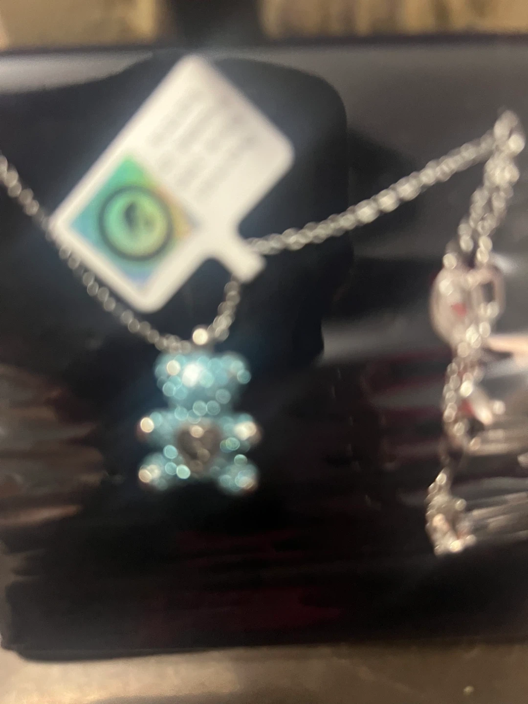 This is a Swarovski teddy bear pendant necklace. The set features sparkling blue crystals and a silver-toned chain. It's a charming accessory for anyone who loves playful yet elegant jewellery!