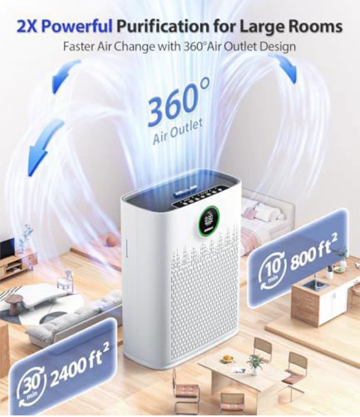 This air purifier offers 2x powerful purification for large rooms. It features a 360° air outlet design for faster air change. Smart mode with a real-time AQI display and an accurate PM2.5 sensor makes it perfect for pet owners and allergy sufferers.