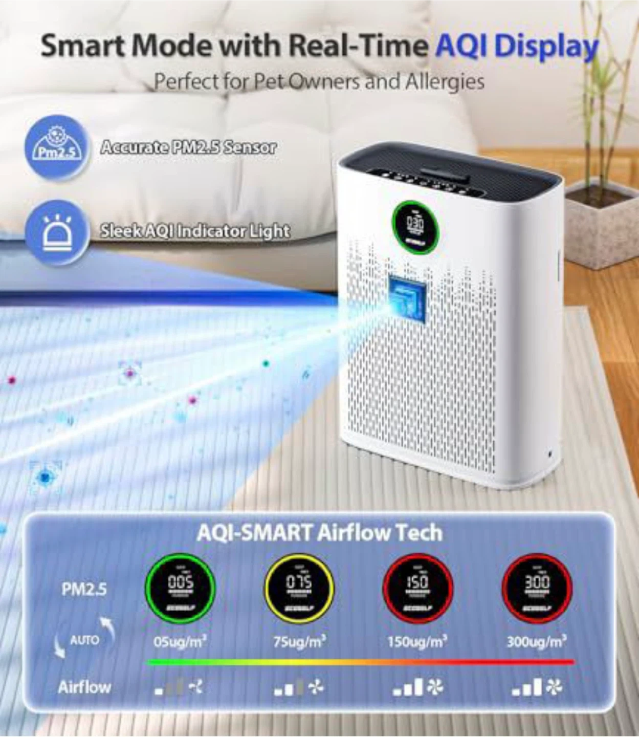 This air purifier offers 2x powerful purification for large rooms. It features a 360° air outlet design for faster air change. Smart mode with a real-time AQI display and an accurate PM2.5 sensor makes it perfect for pet owners and allergy sufferers.